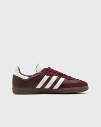 The adidas Samba OG has its roots in indoor sports, but today it is an integral part of urban streetwear. The combination of smooth leather and fine suede overlays gives it a sophisticated look with retro charm. The color scheme features a mix of earthy tones and sophisticated college colors, giving this classic a fresh and modern look. With its sturdy rubber sole and soft inner lining, it offers both traction and all-day comfort. - Laces - Leather upper - Synthetic lining - Rubber outsole Article Number: JR8844 Gender: Men, Women Color: MAROON/OWHITE/GUM3 Material: 30% Rubber, 70% Synthetic/Textile