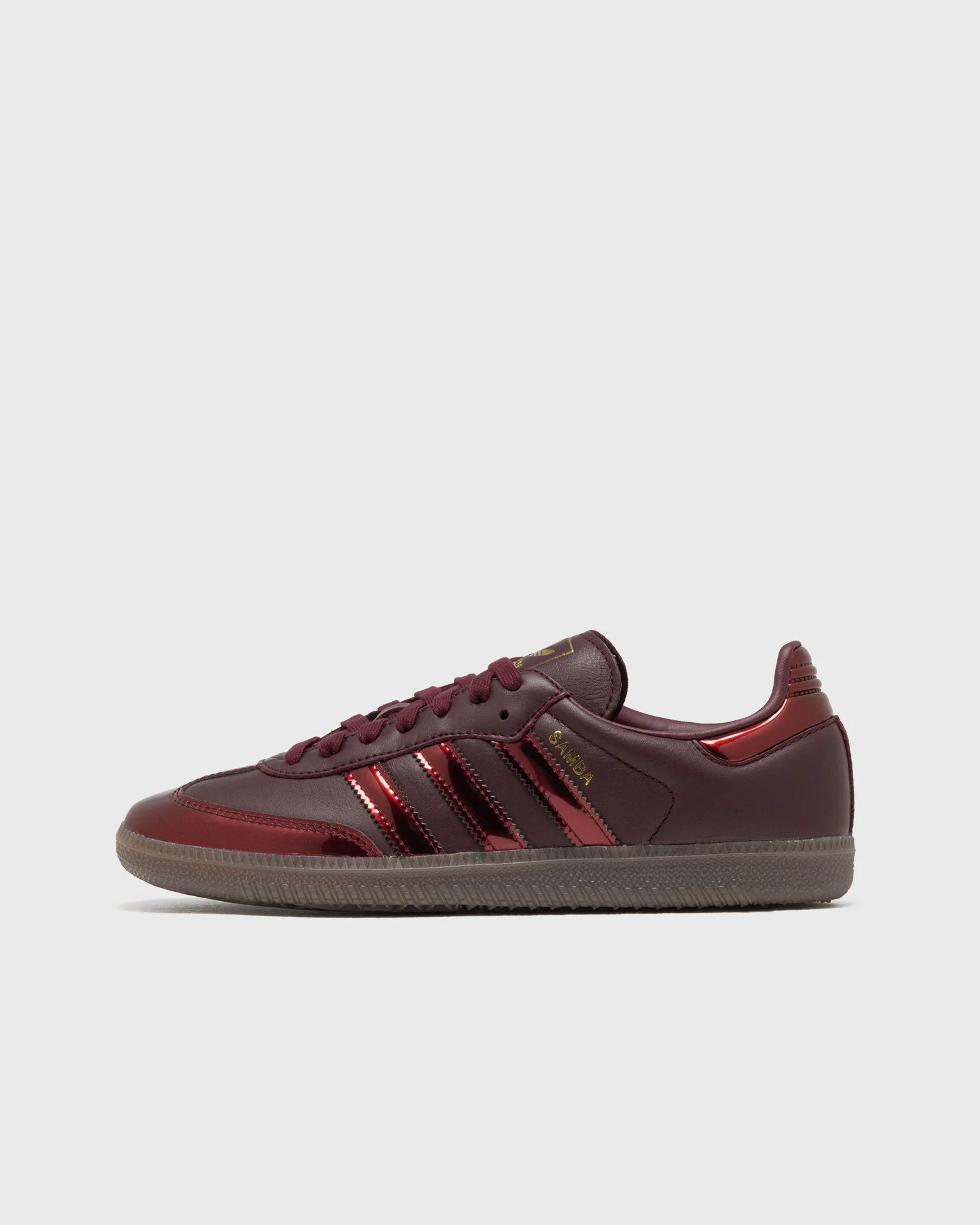 The classic adidas Samba OG in a striking metallic burgundy look. This legendary sneaker model combines timeless retro sports style with modern accents: the high-quality upper with a shimmering finish and the iconic 3-stripes in a metallic look create a genuine streetwear vibe, while the flat rubber outsole provides comfort and grip for everyday wear. - Lace-up closure - Metallic-look 3-Stripes - Rubber outsole Article number: KI4192 Gender: women Color: MAROON/MAROON/GOLDMT Material: 30% Rubber, 70% Leather