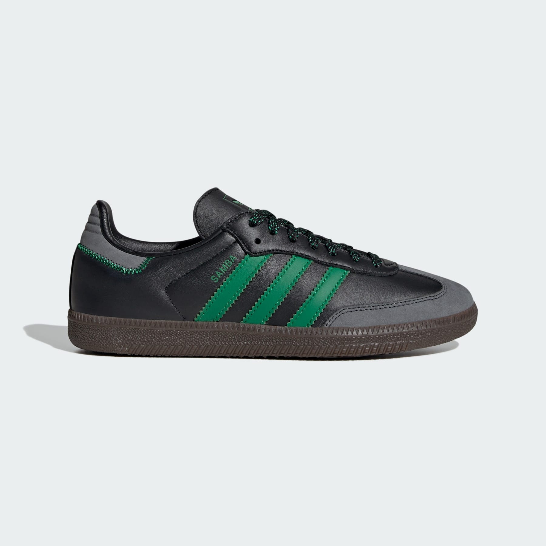 Heritage shoes with hits of color and an OG aesthetic. The Samba OG shoes revive the iconic indoor soccer trainer from the 1950s. Premium leather and suede elevate the upper and set off the classic serrated 3-Stripes. The zigzag stitched heel and speckled toe design add subtle details. Details - Regular fit - Lace closure - Leather and suede upper - Textile lining - Rubber outsole - Imported - Product code: IE6520 - Product color: Core Black / Green / Grey Six