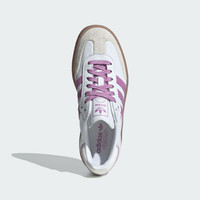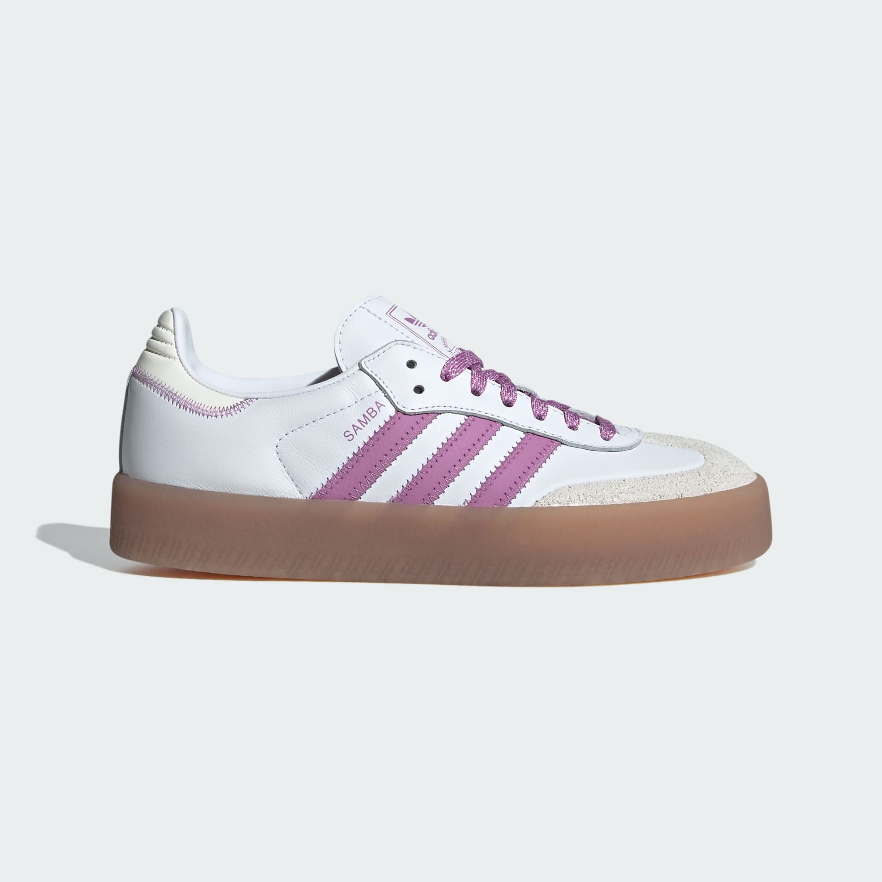 Archive-inspired sneakers made with premium materials. More than 70 years since its debut, the Samba gets a refresh with these adidas Sambae shoes. A premium leather and synthetic upper sits on an exaggerated midsole and gum rubber outsole. The tongue features "The Brand with the 3-Stripes" in multiple languages for a signature touch. Details - Regular fit - Lace closure - Leather and synthetic upper - Synthetic lining - Gum rubber outsole - Imported - Product code: IE9106 - Product color: Cloud White / Preloved Purple / Off White