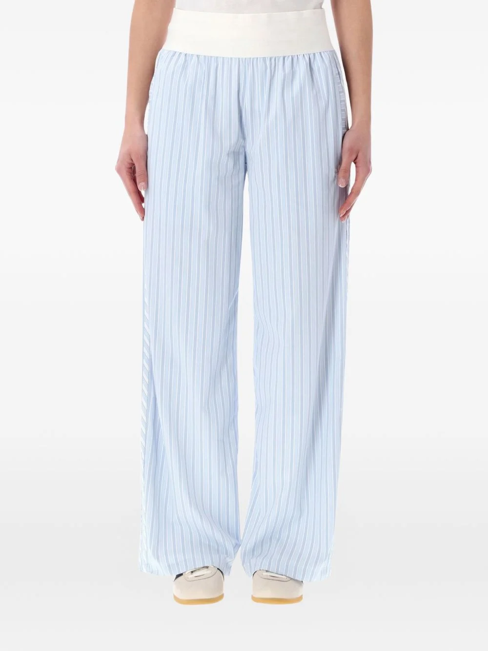 striped trousers Highlights - Blue - Striped pattern - Elasticated waistband - Wide leg Imported Composition Recycled Polyamide 94%, Elastane 6% Washing instructions Read Manufacturer Guidelines