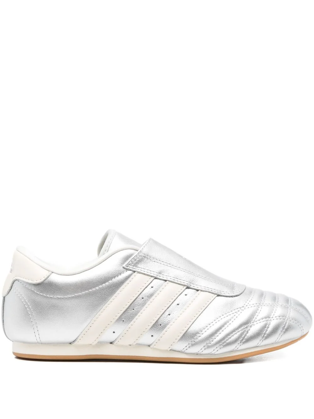 three-stripe metallic-leather sneakers Highlights - Silver - Metallic leather - Three stripes - Hook-and-loop strap - Low top - Round toe Imported Composition Sole: Rubber 100% Outer: Calf Leather 100% Lining: Fabric 100%