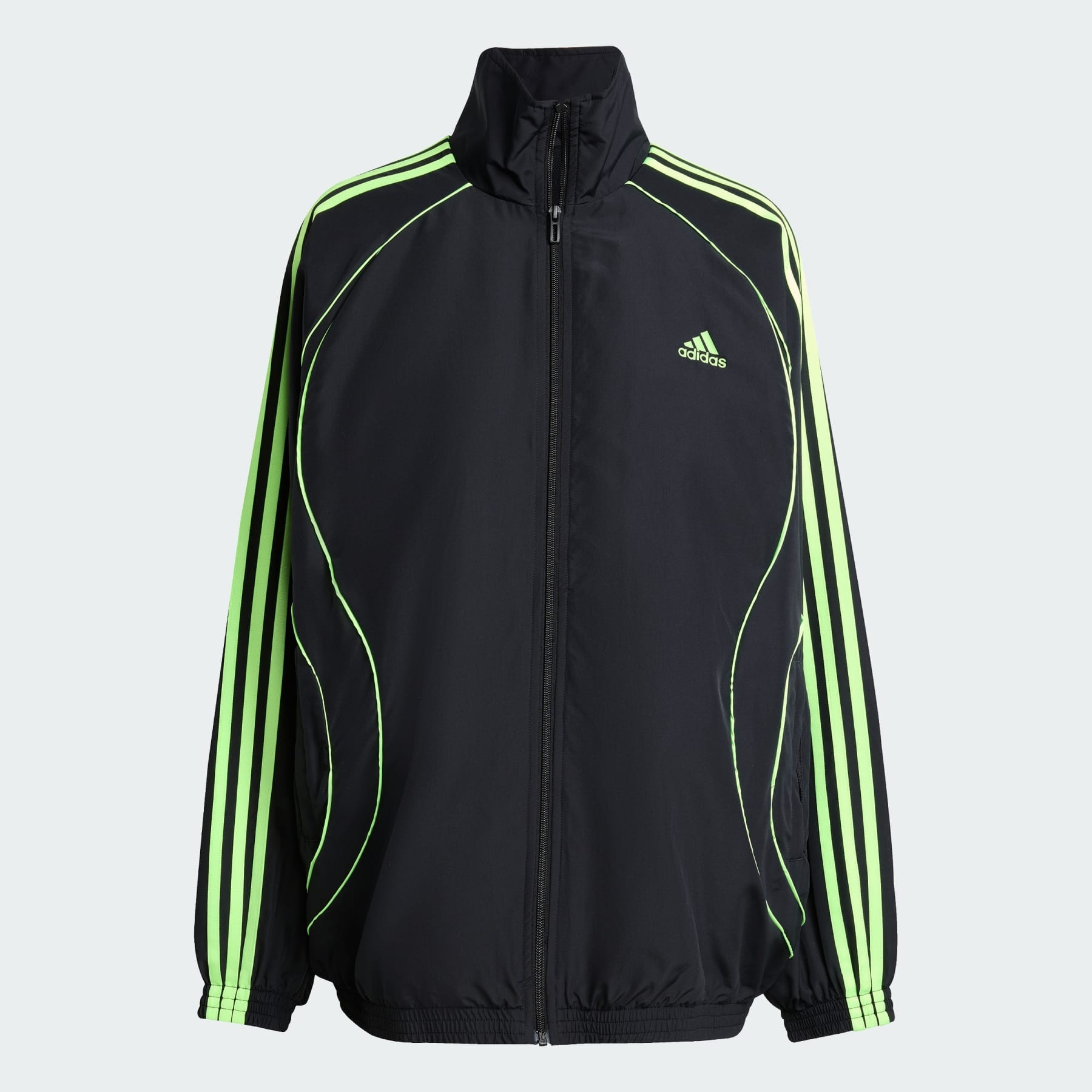 A track top with an oversized fit. This adidas track top is all about sporty style. It's made from woven fabric that's soft and lightweight, and generously cut to layer easily over your favorite tees. Signature 3-Stripes down the sleeves and a stand-up collar give it that classic athletic look. Details - Oversized fit - Zip closure - 100% polyester (recycled) - Imported - Product code: JY2585 - Product color: Black / Signal Green