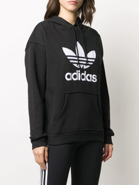 Trefoil logo print hoodie Highlights - Black and white cotton trefoil logo print hoodie from adidas featuring a hood with drawstring tie fastenings, long sleeves, a relaxed fit, a kangaroo pocket and a ribbed hem and cuffs. Imported Composition Cotton 100% SIZE & FIT Model measurements Height 5 ft 10 in(1.77 m) Bust/Chest 35.03 in(89 cm) Hips 35.03 in(89 cm) Waist 23.62 in(60 cm) FittingInformation This piece fits true to size. We recommend you get your regular size Cut for a relaxed fit Made with a mid-weight fabric Washing instructions Machine Wash