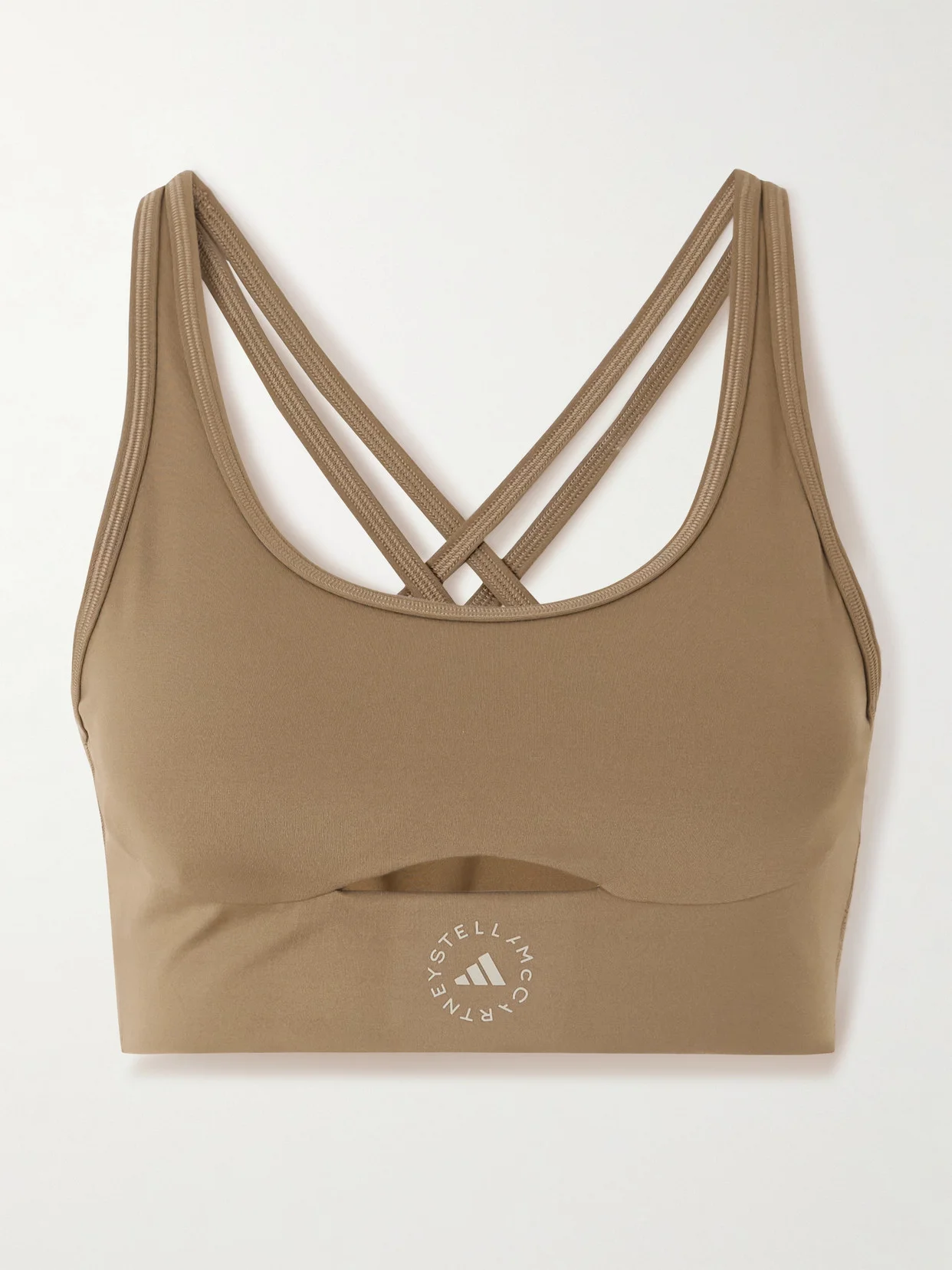 A lattice of slim back straps give adidas by Stella McCartney's 'TrueStrength' sports bra total ease of movement. With compressive, medium support that's ideal for circuits, dance or spin class, it's made from smooth stretch recycled-jersey with a breezy cutout in the underband, and removable cup padding.