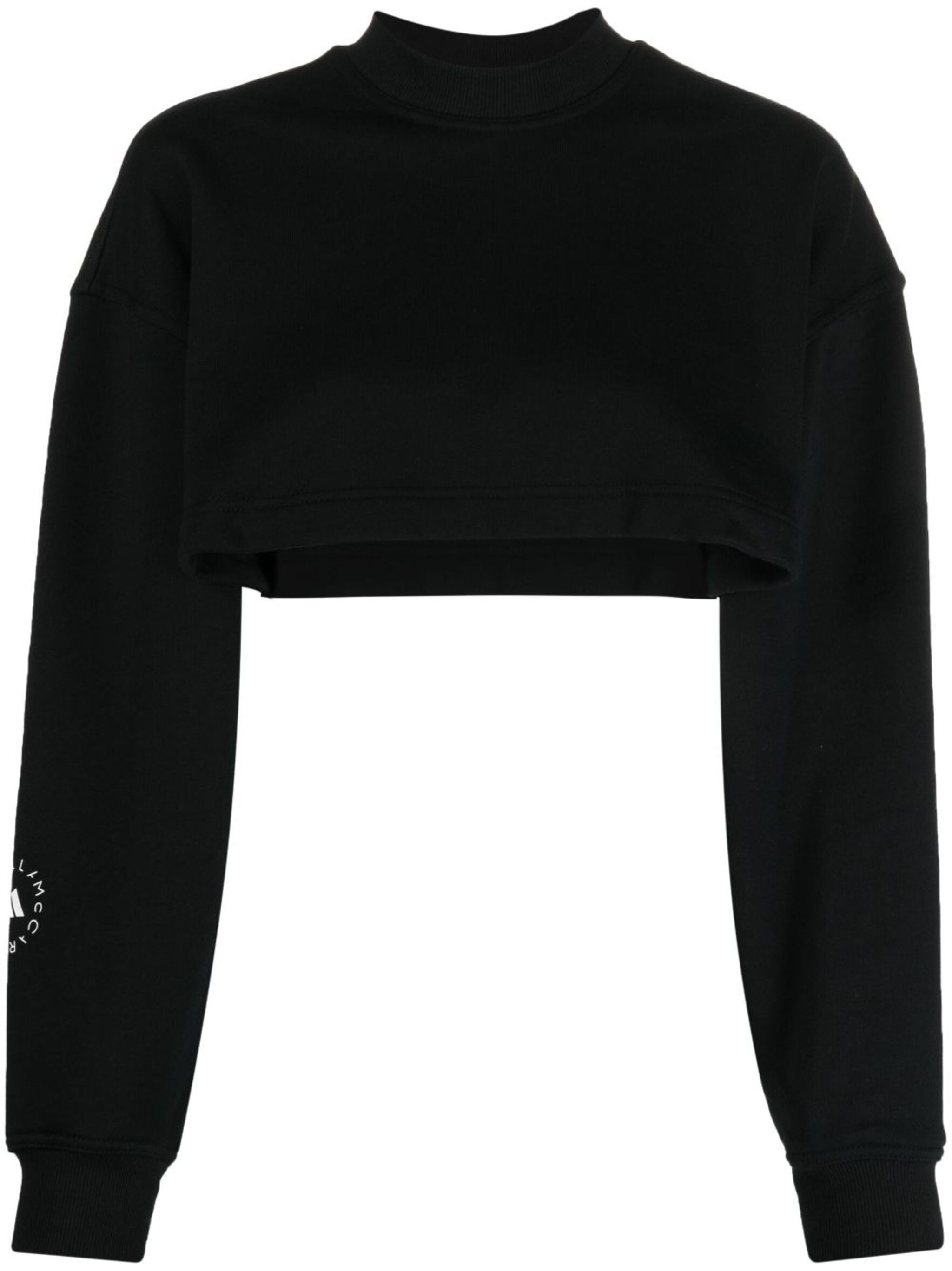 TrusCasuals cropped sweatshirt from adidas by Stella McCartney featuring black, organic cotton, jersey fleece, logo print at the sleeve, crew neck, long sleeves, ribbed cuffs, open back, cropped and straight hem. This item is made from at least 50% organic materials.. Learn more about what makes a product Conscious on our Conscious Criteria page. Size & Fit Model Measurements: Bust: 78cm Height: 177cm Hips: 90cm Waist: 62cm