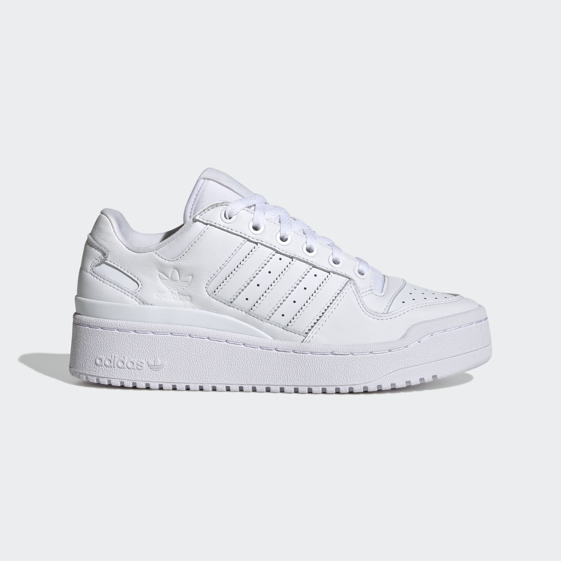 Express yourself in this new take on an OG shoe. Put your true personality on display in these adidas Forum Bold Stripes Shoes. A rebuild of the 1984 Forum, these sneakers are true to all the original details, pattern and materials. Oversized Trefoil elements accentuate a playful style while exaggerated proportions on the rubber platform outsole help you stand tall above the crowd. Details - Regular fit - Lace closure - Leather upper - Textile lining - Rubber platform outsole - Imported - Product code: ID6843 - Product color: Cloud White / Cloud White / Core Black