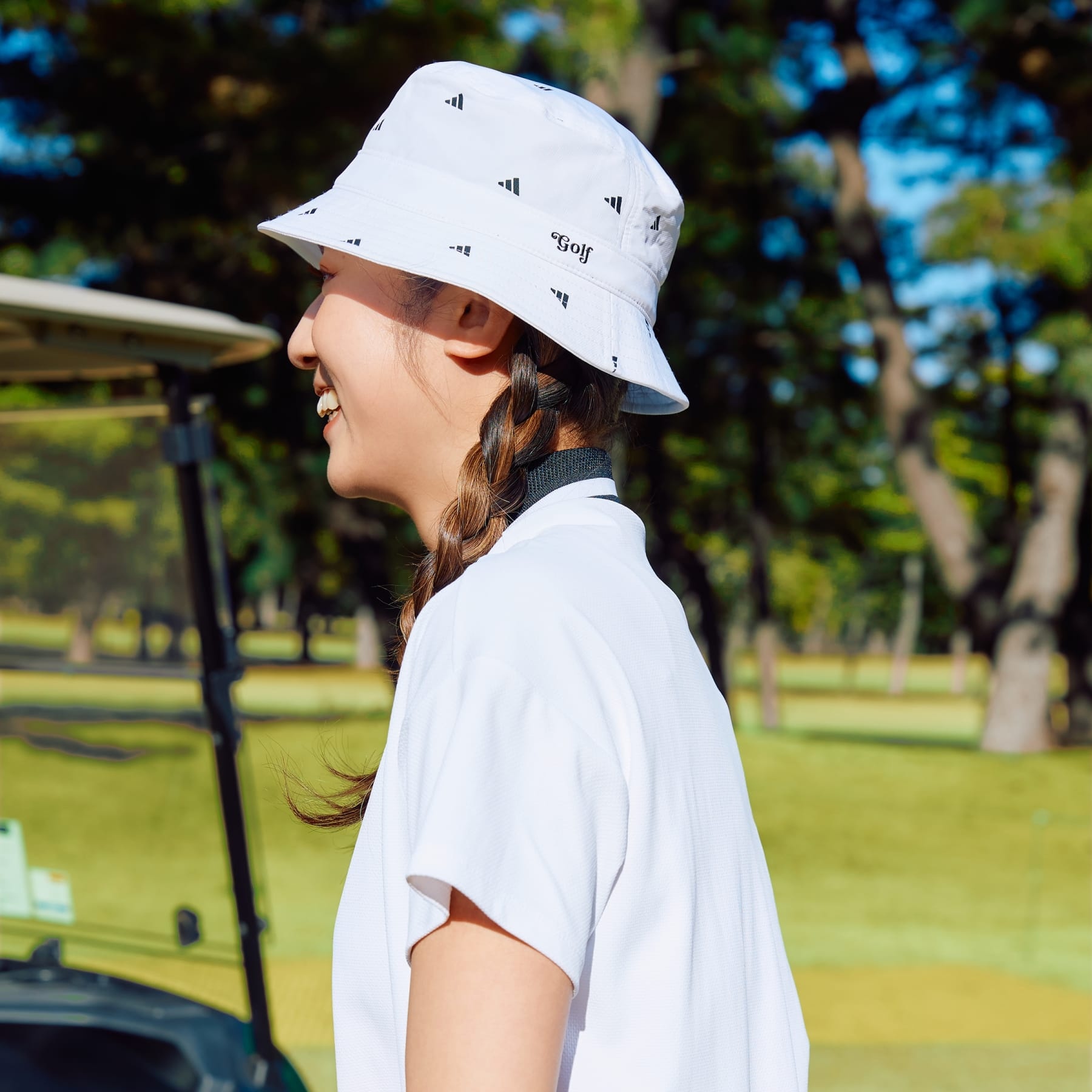 A fun golf bucket hat made in part with recycled materials. Stay cool in style out on the course. This women's golf bucket hat shades you from the sun and elements while its all-over print adds flair to any look. This product is made with at least 50% recycled materials. By reusing materials that have already been created, we help to reduce waste and our reliance on finite resources and reduce the footprint of the products we make. Details - One size fits most women - 100% polyester (recycled) - All-around brim - Classic bucket shape - All over 3 Bar Logo print - "Golf" embroidery on side - Imported - Product code: IT1212 - Product color: White