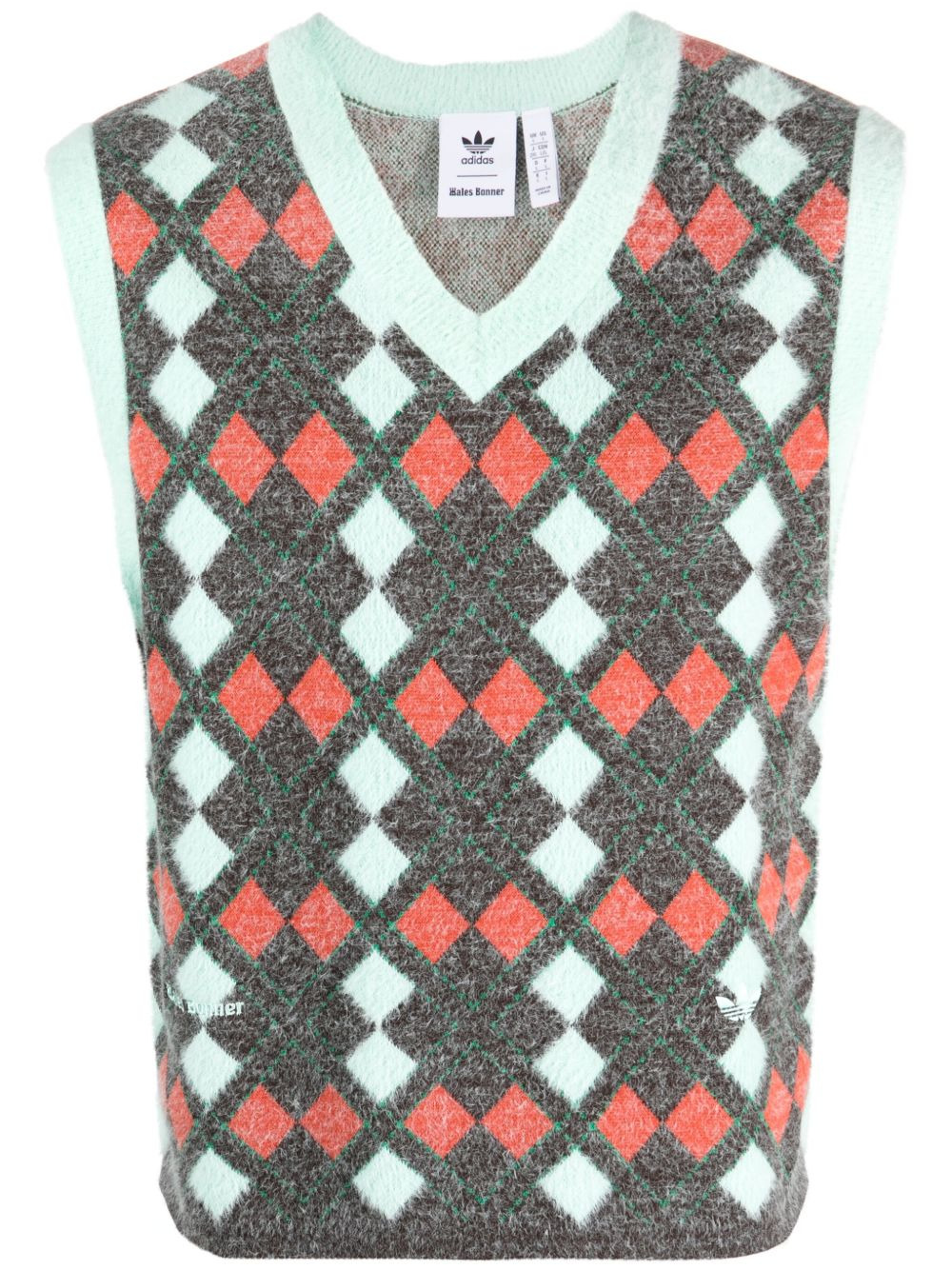 x Wales Bonner argyle-check knitted vest Highlights - Mint green/multicolour - Cotton blend - Brushed effect - Argyle intarsia knit - V-neck - Sleeveless - Straight hem - When buying this unisex item, keep in mind that it is graded in standard men's sizing. Imported Composition Recycled Polyester 53%, Cotton 23%, Rayon 20%, Polyamide 4% SIZE & FIT Model measurements Height 5 ft 9 in(1.76 m) Bust/Chest 33.07 in(84 cm) Hips 34.64 in(88 cm) Waist 25.59 in(65 cm) FittingInformation This unisex piece is designed for a relaxed fit whether you usually select women's or men's sizes Made with a midweight knit, this piece offers some stretch