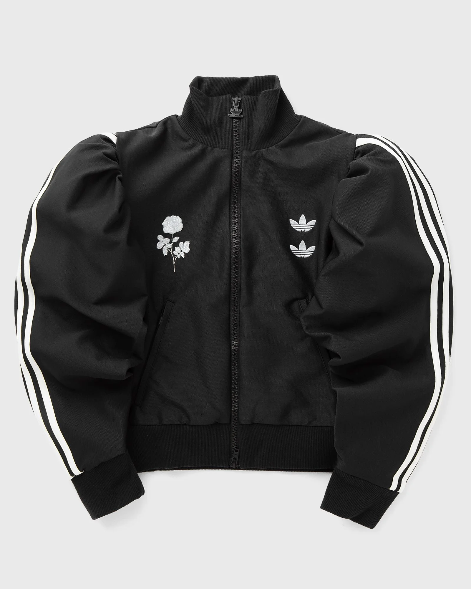 The adidas Chavarria Blouse Track Top combines sporting heritage with designer flair. Made from durable recycled polyester twill, it has a figure-hugging fit and makes a statement with eye-catching puff sleeves. Ribbed collar, cuffs, and hem ensure comfort, while two welt pockets add practicality. Embroidered Trefoil logos, a rose, and the iconic 3-Stripes on the shoulders and sleeves complete the look. - Metal zippers with Willy Chavarria zipper pulls - Ribbed collar, cuffs, and hem - Applied 3-Stripes branding - Two embroidered stacked Trefoil logos on the left chest and one embroidered rose on the right chest - Poly down fill - Two welt pockets on the front - Cupro lining Article number: KD9353 Gender: women Color: black Material: 91% Polyester, 9% Spandex/elastane