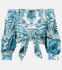 Known for bold prints and fluid silhouettes, Adriana Degreas redefines beachside glamour. This printed crop top features a self-tie front and structured shoulder pads, adding a touch of sophistication to its effortless design. Product Details - Material: 100% viscose - Care instructions: hand wash - Made in Brazil - Color: blue - Designer color name: Blue - Item color: blue - Shoulder pads - Closure: self-ties - Item number: P01045859 Size & Fit - True to size - Designed for a loose fit - Adjustable hem - Non-stretchy fabric - Cropped - The model seen in the picture is 178cm-5'10" and wearing a size XS