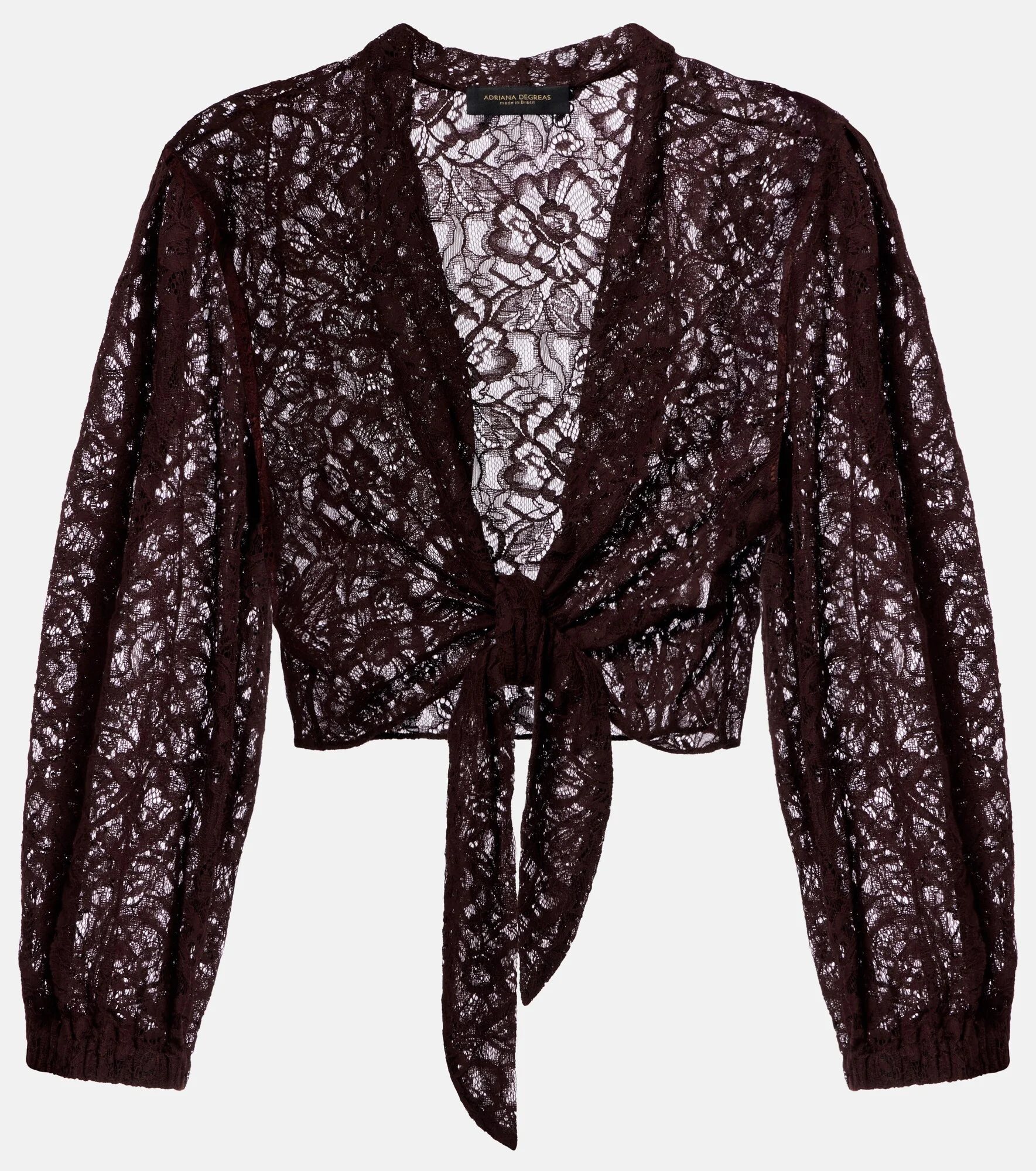 Blending Brazilian glamour with effortless elegance, Adriana Degreas creates statement-making designs. This crop top features is made from floral cotton-blend lace and boasts three-quarter sleeves and a charming self-tie front. Product Details - Material: 53% cotton, 47% polyamide - Care instructions: dry clean - Made in Brazil - Color: brown - Designer color name: Brown - Item number: P01169177 Size & Fit - True to size - Semi-sheer - Loose fit, drawstring waist - Non-stretchy fabric - Slightly cropped - Height of model is 175cm-69" and wears a size S