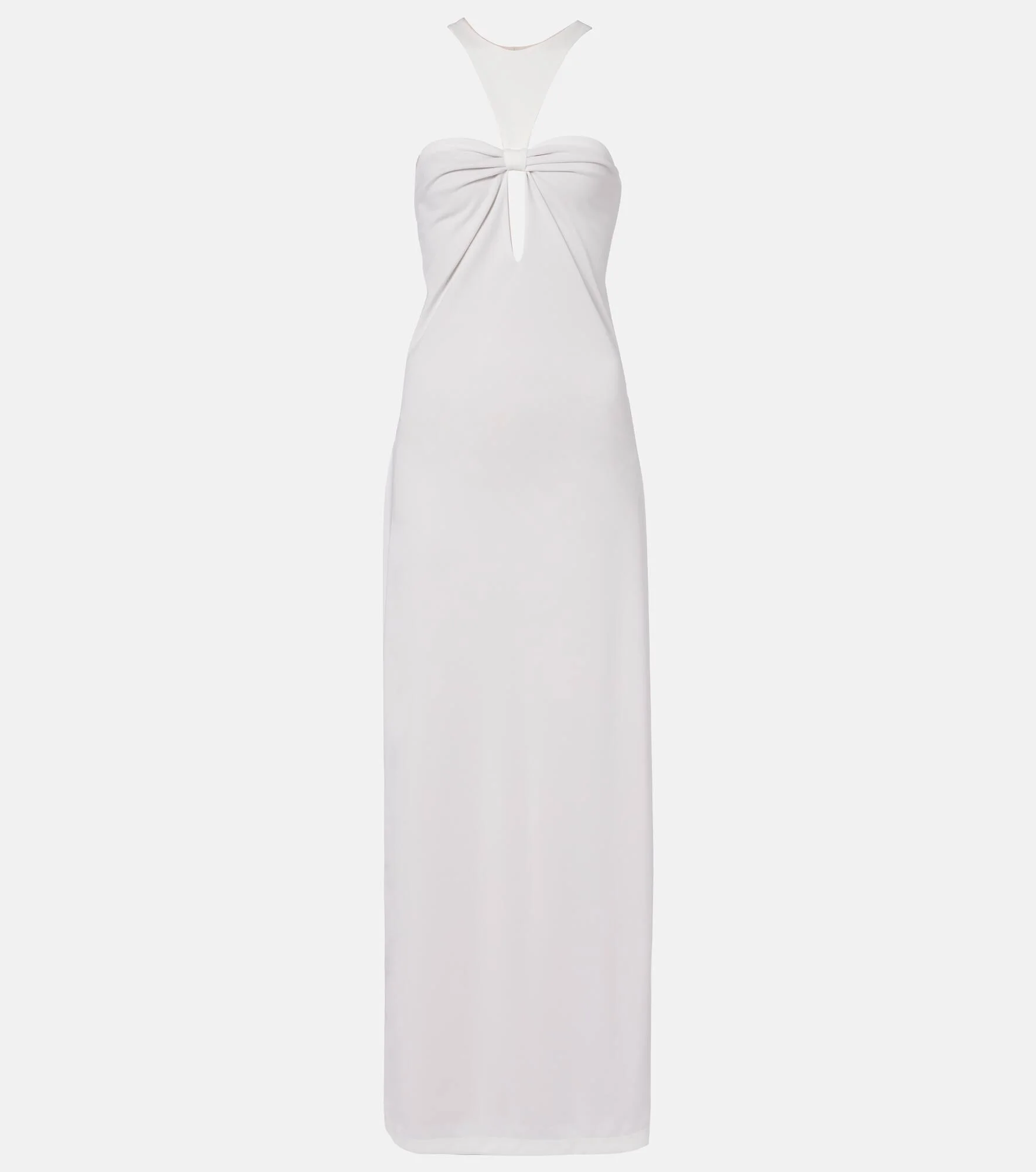 Prepare for evenings out with elegant designs from Adriana Degreas, like this maxi dress. The style features a halter neckline, cutout detailing at the bodice, and an open back for an alluring touch. Product Details - Material: 95% polyester, 5% elastane - Care instructions: dry clean - Made in Brazil - Color: white - Designer color name: 2723+074 - Item color: white - Lining: 84% polyamide, 16% elastane - Closure: buttoned back - Fully lined - Item number: P01077119 Size & Fit - True to size - Low back - Fitted - Slightly stretchy fabric - The model seen in the picture is 178cm-5'10" and wearing a size S
