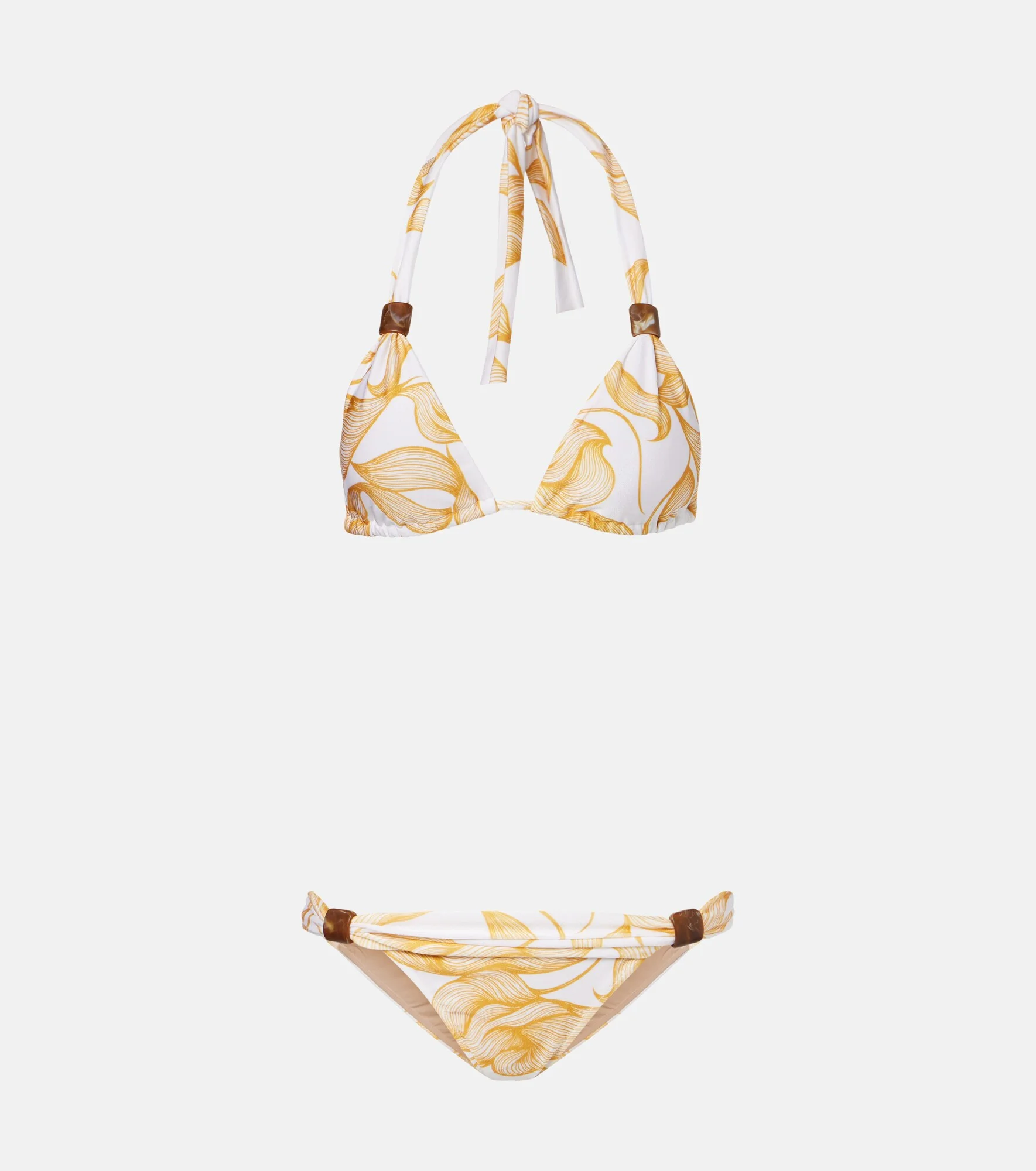 Blending Brazilian glamour with effortless elegance, Adriana Degreas creates statement-making designs. This bikini is a printed style with a classic triangle top and draped bottoms. Product Details - Material: 85% polyamide, 15% elastane - Care instructions: hand wash - Made in Brazil - Color: yellow - Designer color name: Cashew Yellow - Lining: 91% polyamide, 9% elastane - Hardware color: brown - Two-piece set - Padded cups - Self-tie neck and back - Item number: P01162411 Size & Fit - True to size - Removable padding - Minimal coverage - Medium-cut leg - The model seen in the picture is 178cm-5'10", cup size B, and wearing a size S
