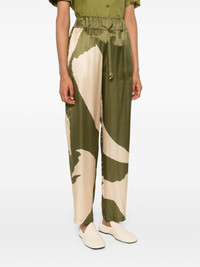 Aurora satin tapered trousers Highlights - Olive green/sand beige - Fsc viscose - Satin weave - Lightweight construction - Abstract pattern print - Two side slash pockets - Full-length - Two rear welt pockets - Tapered leg - Elasticated drawstring waistband - Logo plaque to the drawstring Imported Composition Viscose Satin 100% SIZE & FIT Model measurements Height 5 ft 10 in(1.77 m) Bust/Chest 33.07 in(84 cm) Hips 37 in(94 cm) Waist 24.8 in(63 cm) FittingInformation Designed for a tapered fit, these trousers allow for a close fit at the waist and a loose unrestricted fit over the leg with a closer fit towards the ankle The elasticated waist allows for a comfortable fit Made from a lightweight non-stretch fabric This piece fits true to size – take your usual size Washing instructions Read Manufacturer Guidelines