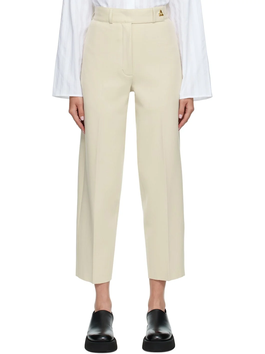 Stretch EcoVero™ and polyester-blend jersey trousers. · Belt loops and buttoned tab at waistband · Zip-fly · Crease front and back · Antiqued gold-tone hardware Supplier color: Cream 70% ecovero viscose, 30% stretch polyester. Made in Hungary 222343F087002