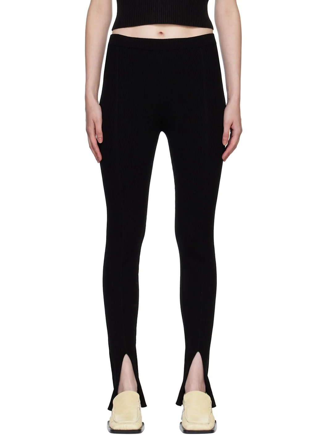 Rib knit FSC-certified viscose and polyester-blend leggings. · Elasticized waistband · Vented cuffs Supplier color: Black 70% viscose, 30% polyester. Made in Italy 222343F085000