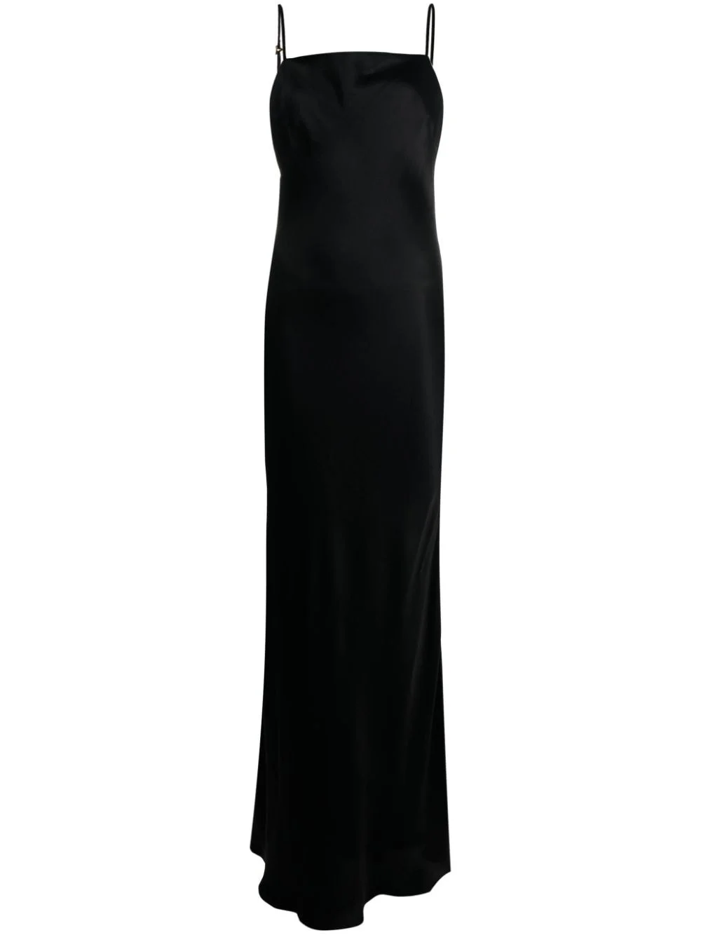 Chaplin satin maxi dress Highlights - Black - Fsc viscose - Satin finish - Bias cut - Monogram plaque - Square neck - Concealed rear zip fastening - Spaghetti straps - Long length Imported Composition FSC Viscose 100% SIZE & FIT Model measurements Height 5 ft 11 in(1.8 m) Bust/Chest 33.07 in(84 cm) Hips 37.4 in(95 cm) Waist 25.19 in(64 cm) FittingInformation Designed for a slim fit that sits just away from the body offering a close yet comfortable fit Made from a midweight non-stretch fabric This piece fits true to size – take your usual size