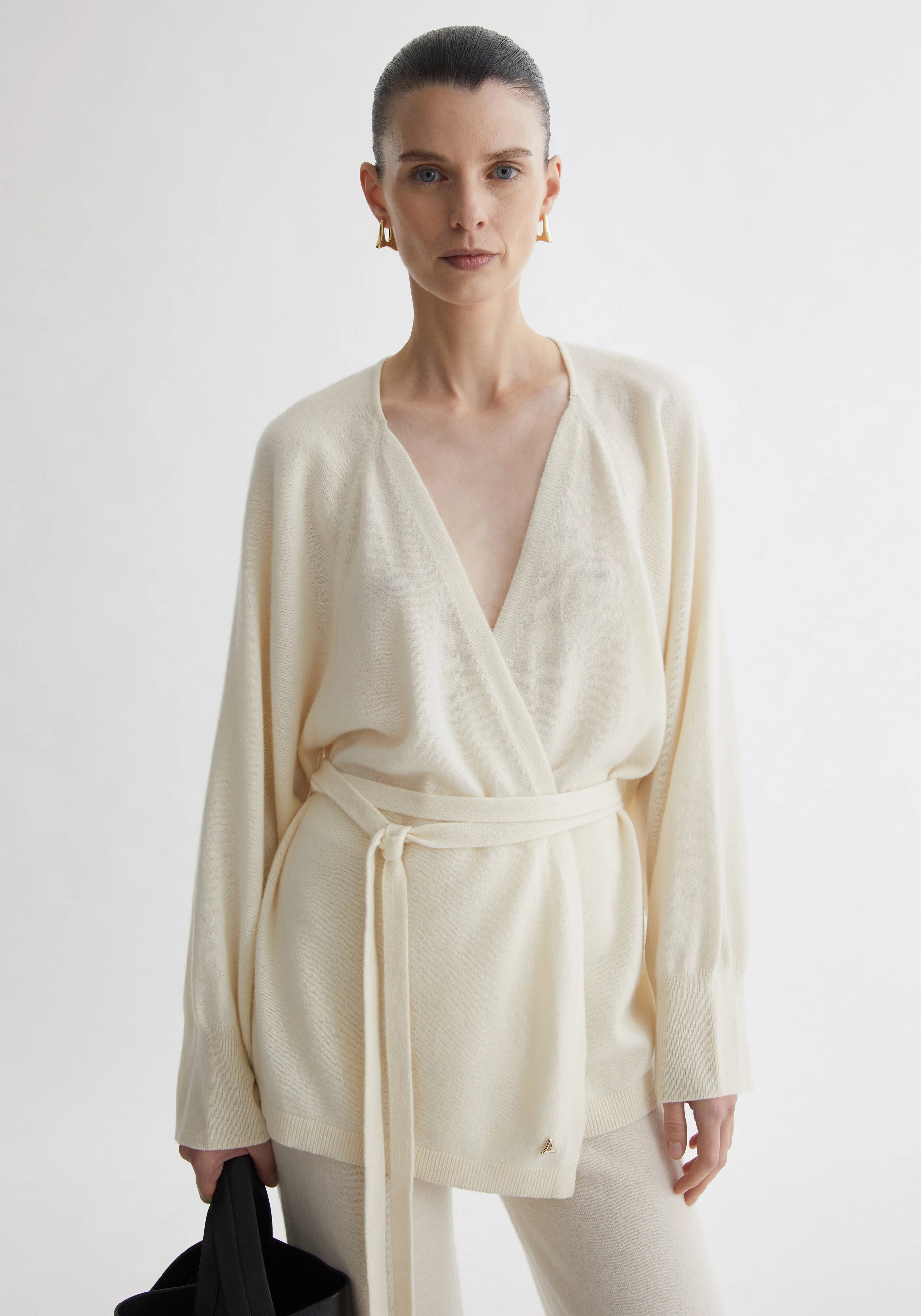 Our CLOUD wrap cardigan is crafted from a luxurious cashmere and wool blend, offering an exceptionally soft, weightless feel that drapes beautifully around the body. Designed with a relaxed, fluid silhouette, it features a deep V-neckline and an elongated self-tie belt that allows for effortless cinching and customizable shape. Subtle rib finishes and a discreet A-motif at the hem add refined structure to its cloud-light softness. Size and Fit Designed for a loose fit, in case you do not prefer a loose fit take one size smaller than usual. The model is 177 cm and wears a size S. Fabric and Care 70% wool, 30% cashmere Do not wash, Do not bleach, Do not tumble dry, Do not iron, Dry clean