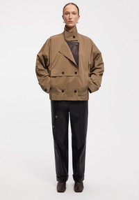 Our CORAL cropped trench jacket is crafted from a lightweight, wind-resistant technical fabric. This piece features an oversized silhouette with wide sleeves, double-breasted closure, and a distinctive cropped length for a contemporary edge. A smooth leather lapel insert adds unexpected texture and contrast at the collar, enhancing its sculptural structure. Size and Fit Fits true to size, take your normal size. The model is 173 cm and wears a size 36. Fabric and Care 100% Recycled Nylon Details: 100% Leather Do not wash, Do not bleach, Do not tumble dry, Iron at low temperature, Suitable for dry cleaning, Suitable for professional wet cleaning