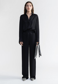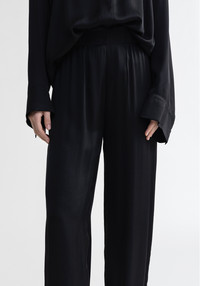 Our COUGAR satin pants are made of a sustainable FSC Certified Viscose blend. This elegant yet versatile piece is cut to a straight leg silhouette and has an elastic waistband. Size and Fit Fits true to size, take your normal size. The model is 180 cm and wears a size 36. Fabric and Care 52% FSC Viscose 48% Rayon Do not wash, Do not bleach, Do not tumble dry, Iron low temperature, Suitable for dry cleaning, Suitable for professional wet cleaning