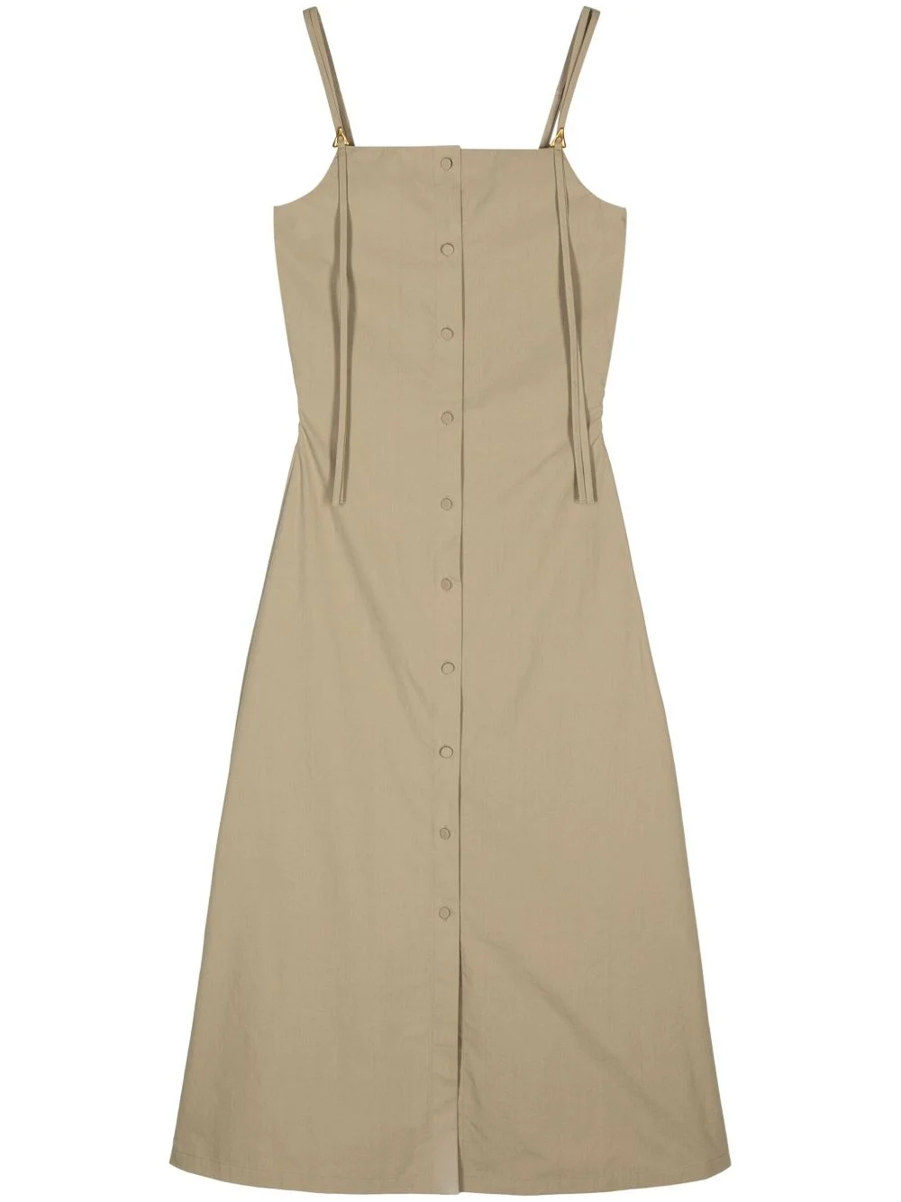 Dionne midi dress Highlights - Olive green - Organic cotton - Poplin texture - Adjustable spaghetti straps - Square neck - A-line skirt - Side slits - Straight hem - Mid-length - Front button placket Imported Composition Organic Cotton 100%