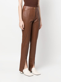 Elm lambskin trousers Crafted from chocolate lambskin, these Elm trousers from AERON reflect the label's contemporary, minimalist aesthetic. The streamlined pair falls to a straight leg, detailed with front slits. Imported Composition Lambskin 100% SIZE & FIT Model measurements Height 5 ft 8 in(1.73 m) Bust/Chest 33.07 in(84 cm) Hips 35.03 in(89 cm) Waist 24.8 in(63 cm) FittingInformation This piece fits true to size. We recommend you get your regular size Cut for a slim fit Made with a mid-weight fabric