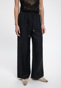 Our GILBERT wide-leg pants are made of a crispy linen blend. This piece has a casual style with adjustable drawstrings featuring hanging A-motifs to give an elegant, standout feel. Size and Fit Fits true to size, take your normal size. The model is 180 cm and wears a size 36. Fabric and Care 86% Linen 14% Polyamide Do not wash, Do not bleach, Do not tumble dry, Do not iron, Suitable for dry cleaning, Suitable for professional wet cleaning