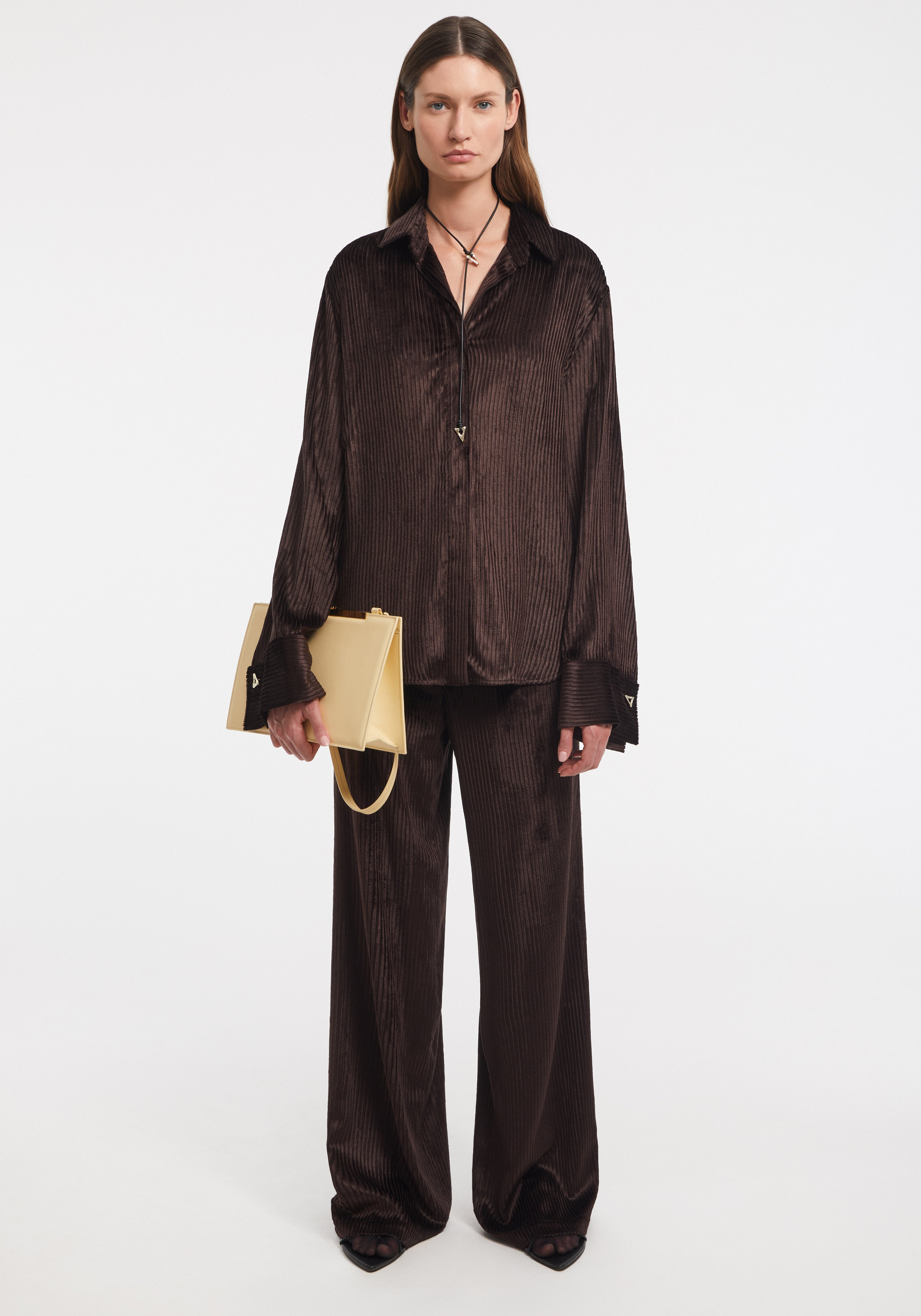 Our GODIVA corduroy shirt is cut from a fluid fabric with a relaxed silhouette and soft drape. Designed with a curved hem and elongated cuffs, it features our A-buttons to balance the oversized fit with an elegant touch. Size and Fit Fits true to size, take your normal size. Fabric and Care 100% viscose Do not wash, Do not bleach, Do not tumble dry, Iron at medium temperature, Dry clean, Do not wring
