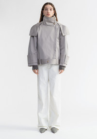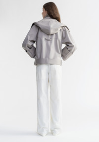 Our LINDEN hooded jacket is made of pure cotton. This piece has an oversized fit and a boxy moto jacket silhouette with curved sleeves. It features an asymmetrical zip closure and a hood. Size and Fit Fits true to size, take your normal size. The model is 180 cm and wears a size 36. Fabric and Care 100% Cotton Do not wash, Do not bleach, Do not tumble dry, Iron low temperature, Suitable for dry cleaning, Suitable for professional wet cleaning