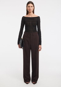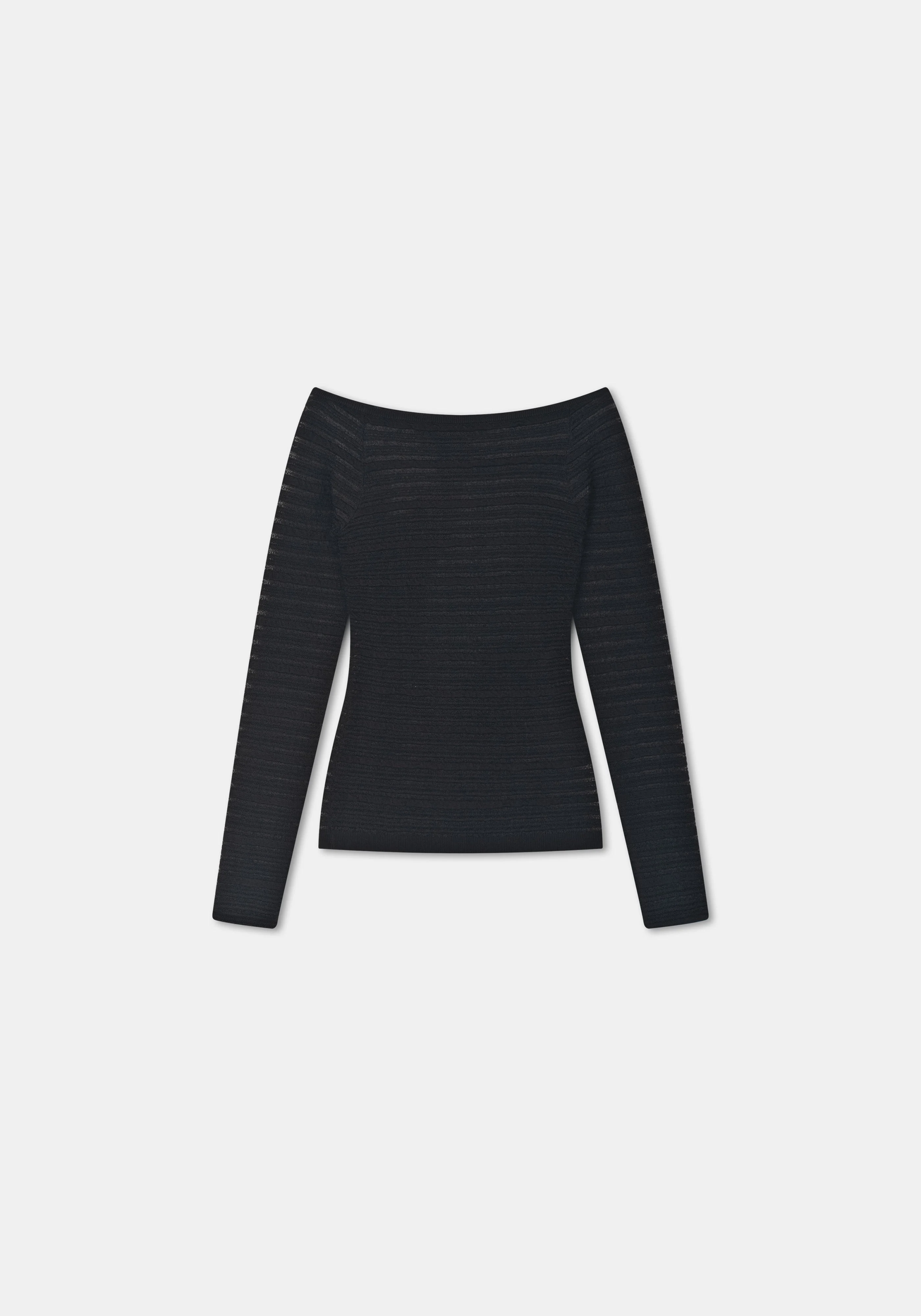 Our HUDSON off-shoulder top has a semi-sheer body with a delicate, textured stripe pattern that adds dimension to its fitted silhouette. This feminine piece features a wide neckline that sits elegantly off the shoulders, making it ideal for layering or wearing on its own as a subtle statement. Size and Fit Fits true to size, take your normal size. Fabric and Care 80% viscose, 15% nylon, 4% polyester, 1% elastane Hand wash at 30°C, Do not bleach, Do not tumble dry, Do not iron, Dry clean, Do not wring
