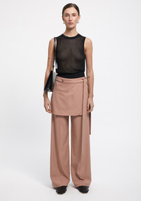 Our HURAA suiting skirt pants are tailored of a sustainable Ecovero Viscose blend. This piece has wide-leg pants including a detachable wrapped mini skirt for an effortlessly elegant and versatile summer look. Size and Fit Fits true to size, take your normal size. The model is 180 cm and wears a size 36. Fabric and Care 83% Ecovero Viscose 14% Polyester 3% Elastane Do not wash, Do not bleach, Do not tumble dry, Iron medium temperature, Suitable for dry cleaning, Suitable for professional wet cleaning