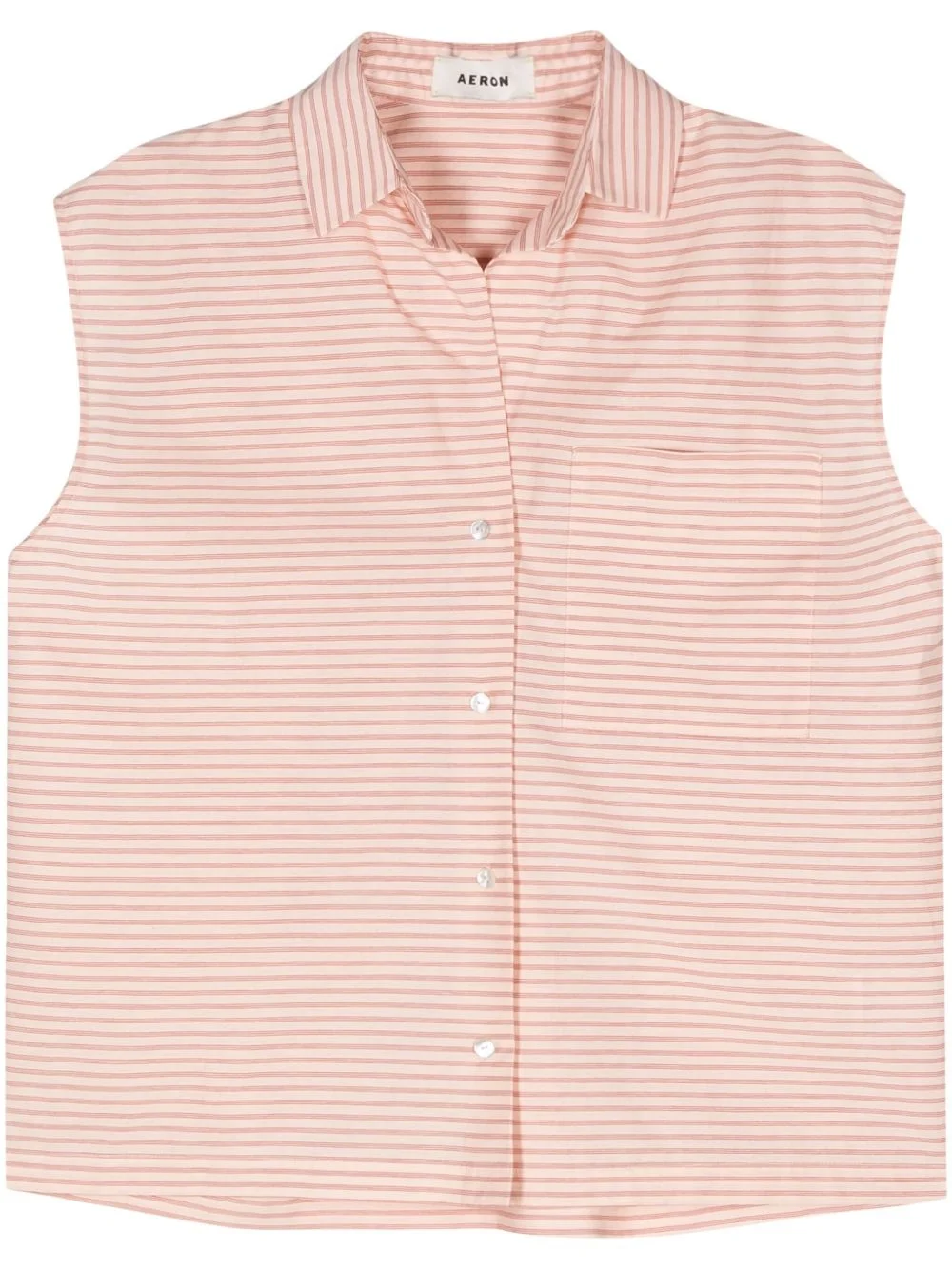 Island sleeveless striped shirt Highlights - Salmon pink - Poplin texture - Horizontal stripe pattern - Spread collar - V-neck - Sleeveless - Chest patch pocket - Pleat detailing to the rear - Straight hem - Mother-of-pearl buttons - Front button fastening Imported Composition Cotton 39%, Fabric 31%, Linen/Flax 30%