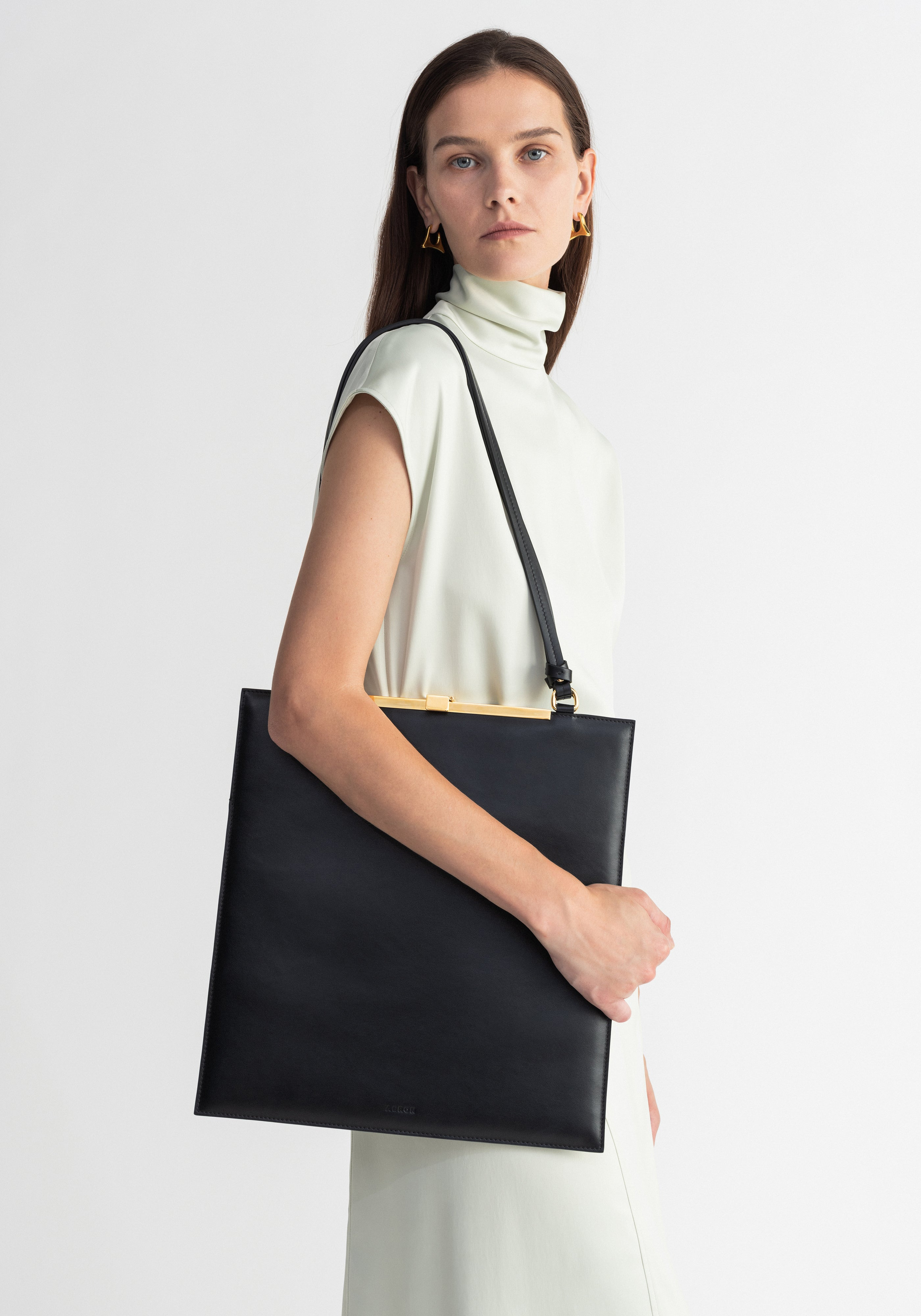 Our JULIETTE shoulder bag is made of dead stock cowhide leather. This piece has a classic and sleek rectangular shape and double shoulder straps. It features a small gold logo on the front and a gold metal closure. It is a practical and sophisticated essential that accompanies women day to night. Size and Fit Height: 37 cm Width: 35 cm Fabric and Care 100% Lambskin leather Do not wash, Do not bleach, Do not tumble dry, Do not iron, Do not dryclean, Consult with leather specialist