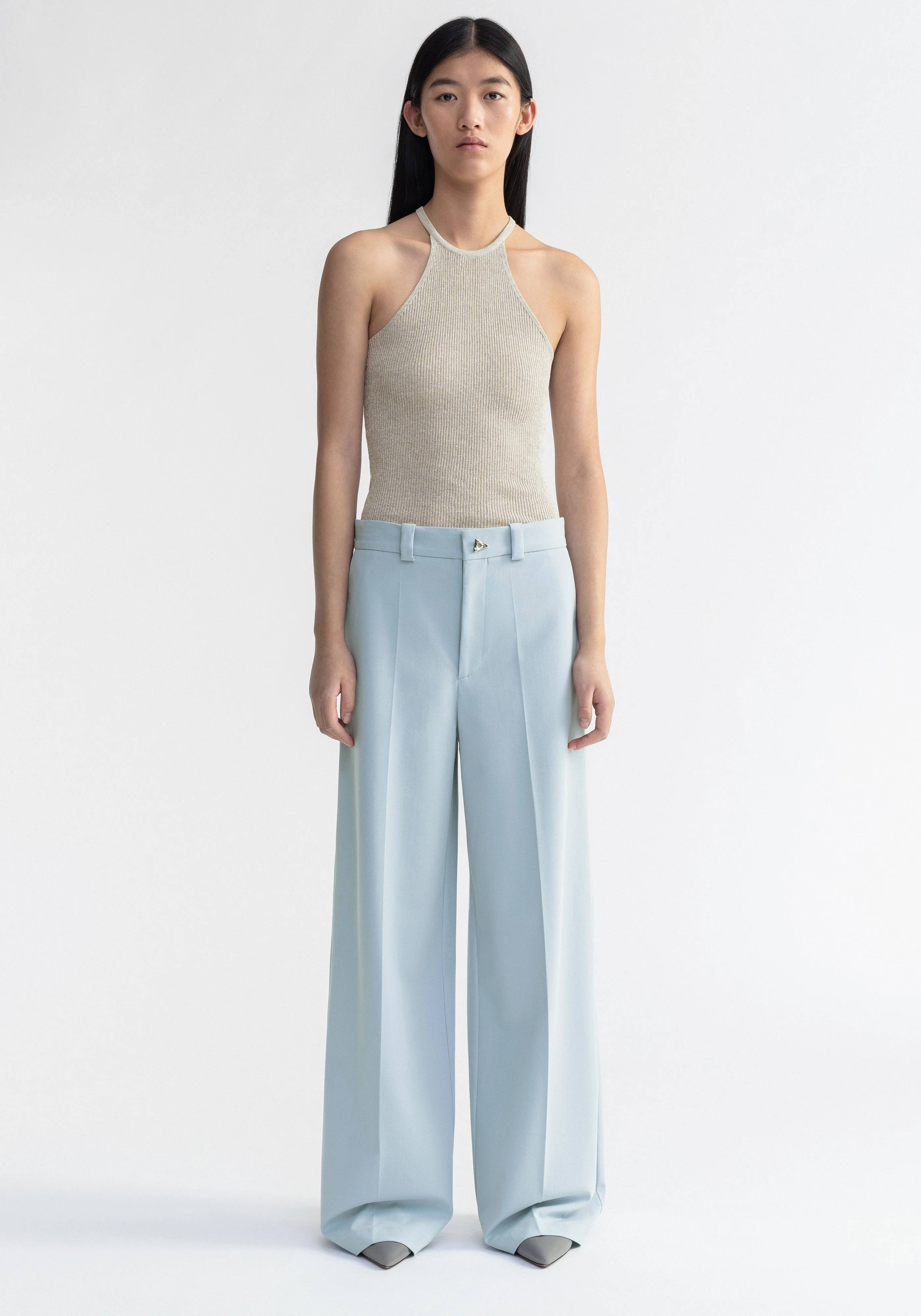 Our KAI wide leg suiting pants are tailored of a sustainable, ecovero viscose and recycled polyester blend. This piece has a relaxed fit and sharp crease lines to emphasize their shape. It is accentuated with our signature A-button at the waist. Wear with our GALINA top for a chic look. Size and Fit Fits true to size, take your normal size. The model is 180 cm and wears a size 36. Fabric and Care 66% Recycled Polyester 28% Ecovero Viscose 6% Elastane Do not wash, Do not bleach, Do not tumble dry, Iron low temperature, Suitable for dry cleaning, Suitable for professional wet cleaning