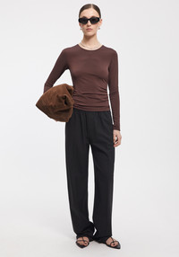 Our KIRK straight-leg suiting pants are made of a smooth recycled polyester and viscose blend. Designed with a relaxed, full-length silhouette, these trousers feature an easy elasticated waistband, front pleats, and side pockets for a tailored look with everyday comfort. Size and Fit Fits true to size, take your normal size. The model is 180 cm and wears a size 36. Fabric and Care 67% Recycled Polyester 29% Viscose 4% Elastane Do not wash, Do not bleach, Do not tumble dry, Iron at medium temperature, Suitable for dry cleaning, Suitable for professional wet cleaning
