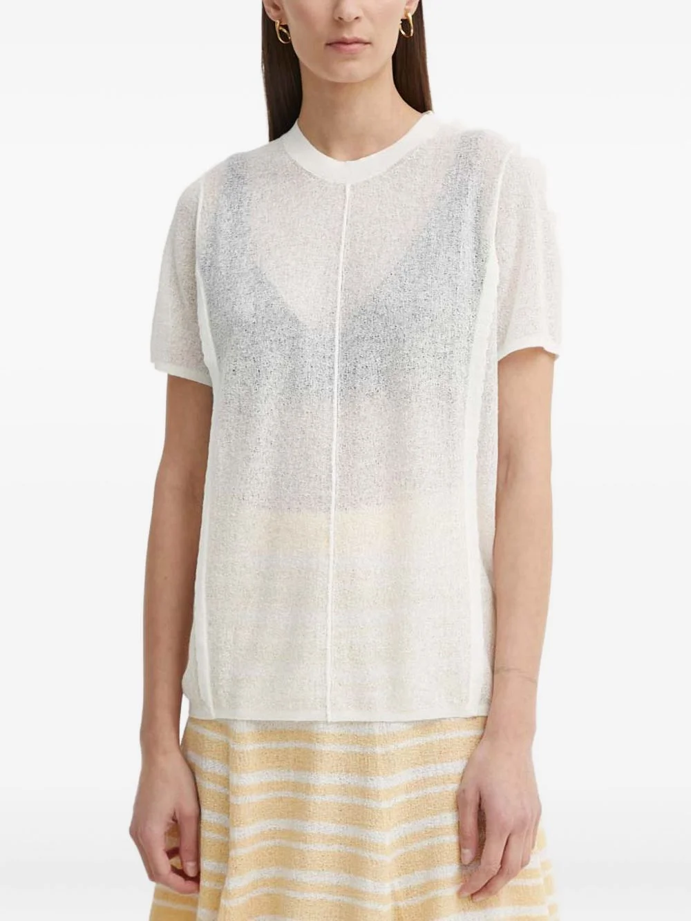 knit short-sleeve T-shirt Highlights - Off-white - Short sleeves - Round neck - Textured knit - Centre seam detail Imported Composition Cotton 39%, Linen/Flax 30%, Recycled Polyester 17%, Nylon 14% Washing instructions Read Manufacturer Guidelines
