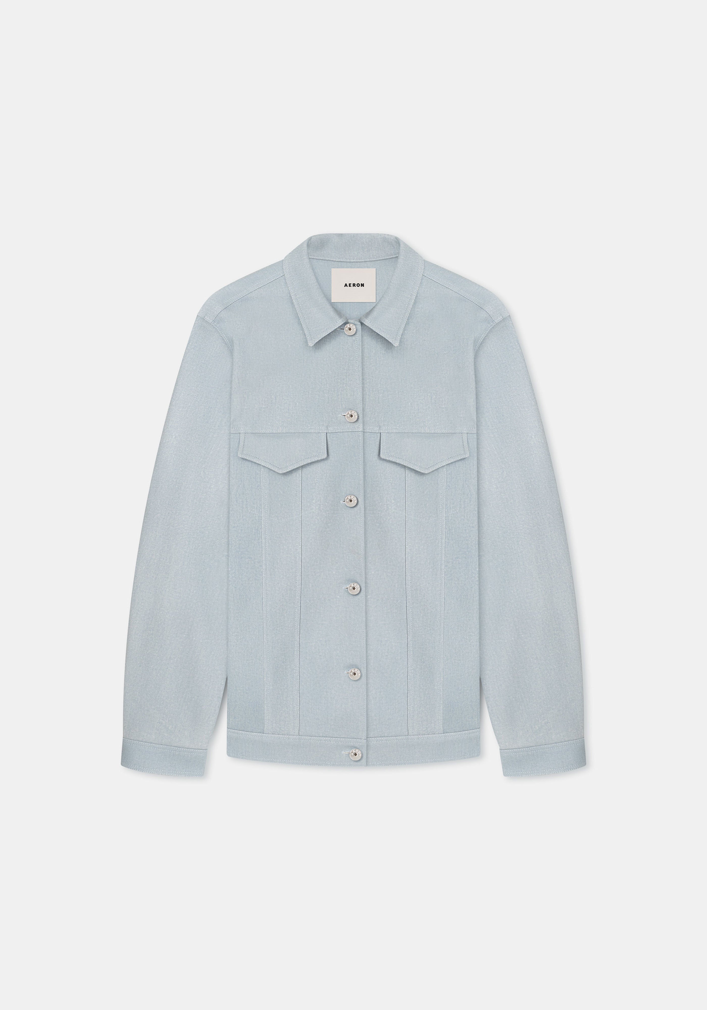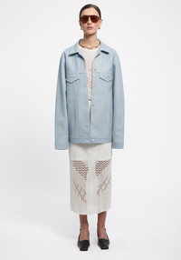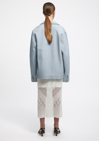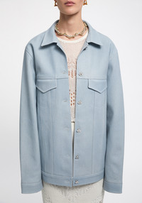 Our LIONEL jacket is made of pure leather that comes from traceable sources. This piece is made with a trompe-l'œil effect, creating a washed denim look. It is cut to a classic trucker jacket silhouette with an oversized fit. Size and Fit Designed for a loose fit, in case you do not prefer an oversized look take one size smaller than usual. The model is 180 cm and wears a size 36. Fabric and Care 100% Lambskin leather Do not wash, Do not bleach, Do not tumble dry, Do not iron, Do not dryclean, Consult with leather specialist