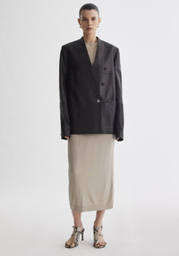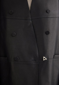 Our LILITH collarless double-breasted boxy blazer is crafted from buttery-soft lambskin leather sourced from traceable origins. Designed with a clean, collarless neckline and an oversized, boxy silhouette, it balances structure with fluidity for a modern, sculptural effect. Discreet double-breasted buttons are complemented by a single signature A-button, adding a subtle focal point to the minimalist design. Fabric and Care 100% lambskin leather; Lining: 100% viscose Do not wash, Do not bleach, Do not tumble dry, Do not iron, Do not dry clean, Consult with leather specialist