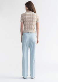 Our LOUI high waisted suiting pants are tailored of a sustainable, ecovero viscose and recycled polyester blend. This piece has a straight fit and cut to a full length silhouette. It features side slant pockets and wide belt loops. Wear with our SONIA top for a contemporary look. Size and Fit Fits true to size, take your normal size. The model is 180 cm and wears a size 36. Fabric and Care 66% Recycled Polyester 28% Ecovero Viscose 6% Elastane Do not wash, Do not bleach, Do not tumble dry, Iron low temperature, Suitable for dry cleaning, Suitable for professional wet cleaning