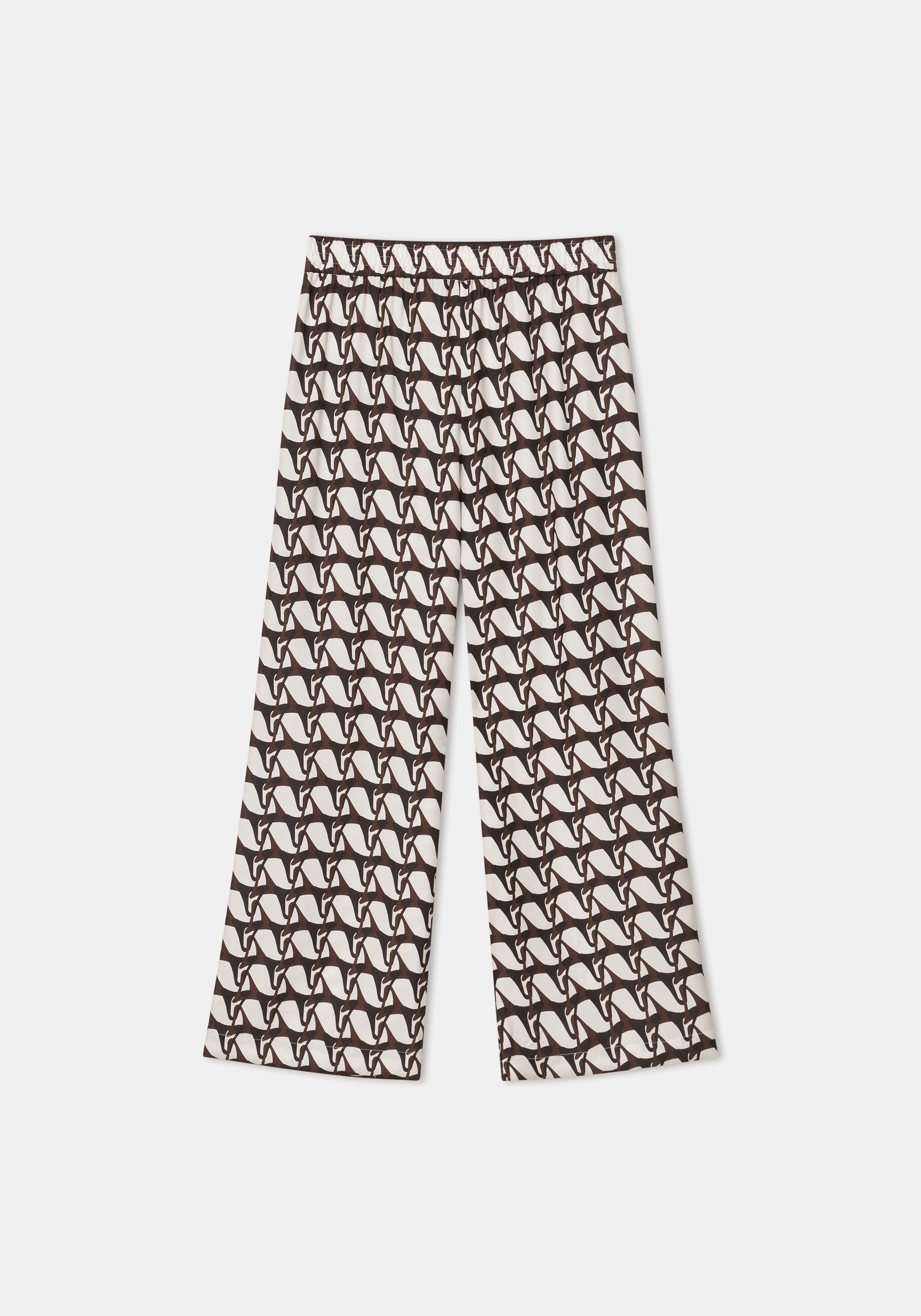 Our MALIK silk pants are made from a sustainable blend of FSC-certified viscose and silk blend. This relaxed, wide-leg silhouette is defined by our signature A-motif in an interlocking all-over print that balances comfort and refinement. Size and Fit Fits true to size, take your normal size. The model is 180 cm and wears a size 36. Fabric and Care 70% FSC Viscose 30% Silk Do not wash, Do not bleach, Do not tumble dry, Iron at low temperature, Suitable for dry cleaning, Suitable for professional wet cleaning"