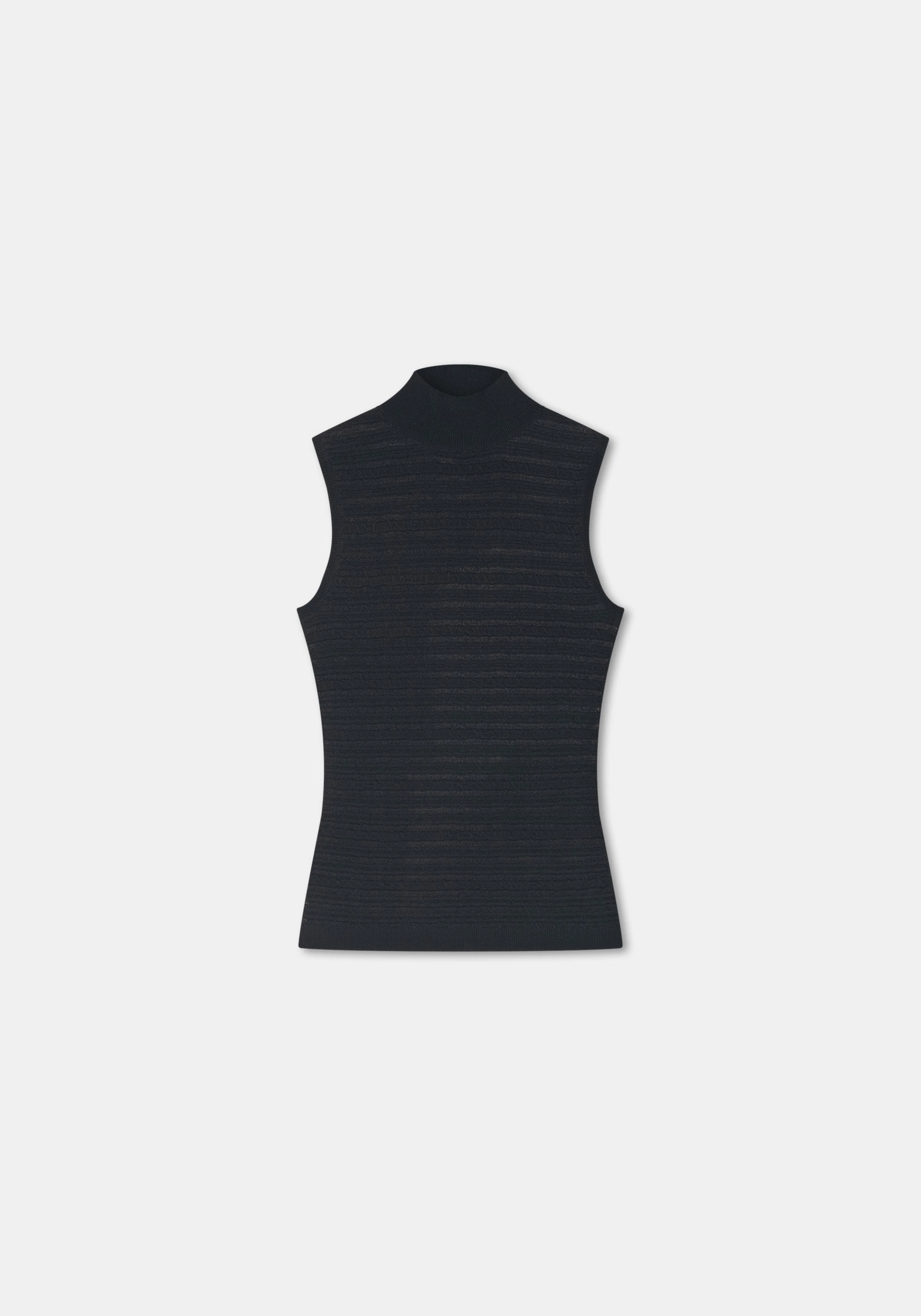 Our MARIBEL sleeveless top has a semi-sheer body with a delicate, textured stripe pattern that adds dimension to its fitted silhouette and features a high neckline. Size and Fit Fits true to size, take your normal size. Fabric and Care 80% viscose, 15% nylon, 4% polyester, 1% elastane Hand wash at 30°C, Do not bleach, Do not tumble dry, Do not iron, Dry clean, Do not wring