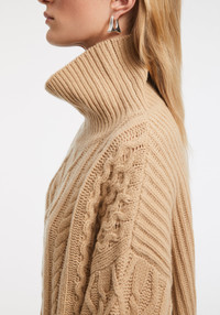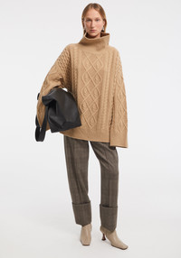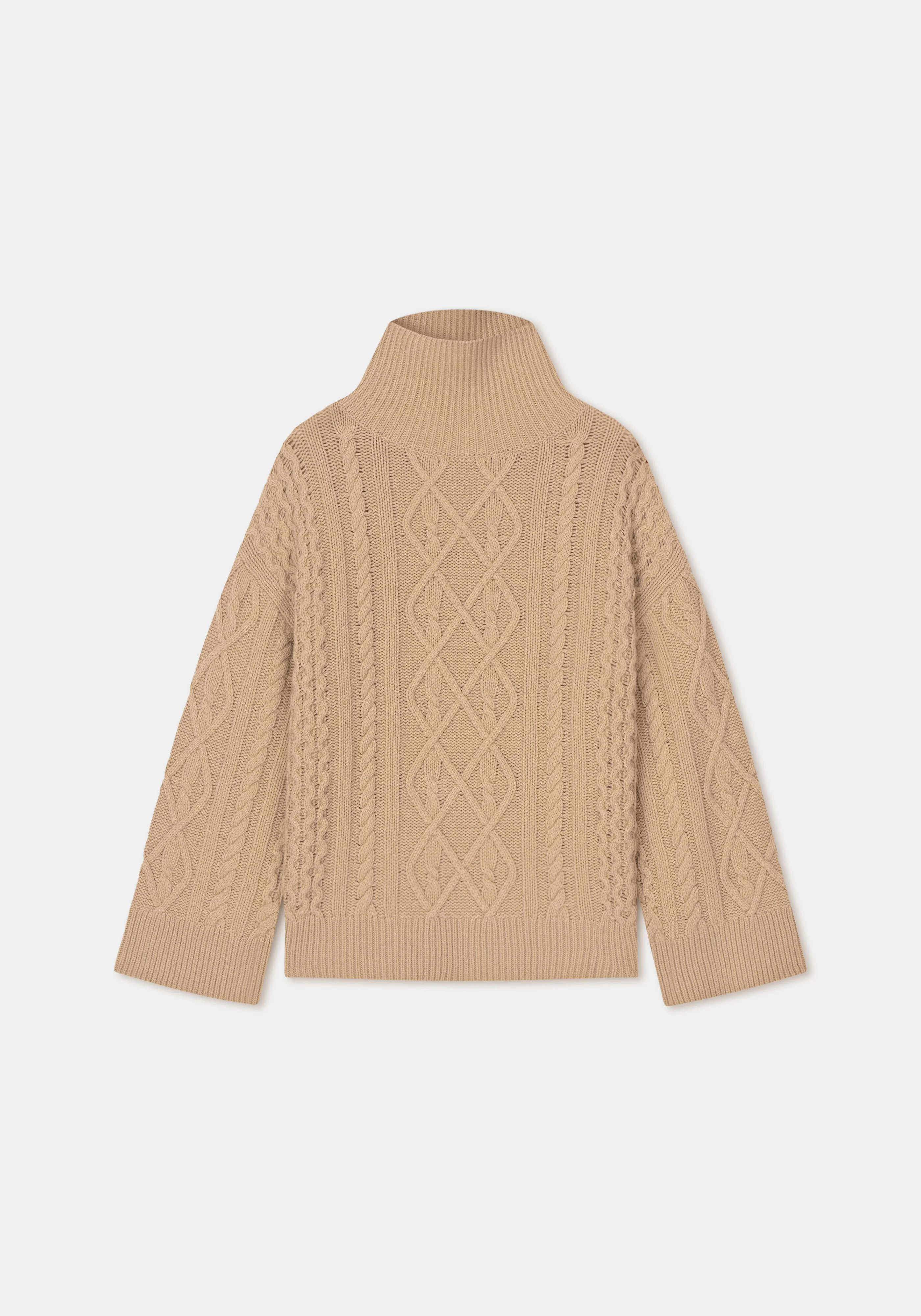 Our MARSHALL oversized cable-knit jumper is made of pure wool. Designed with a funnel neck and a rich cable pattern, it combines comfort with sculptural volume. The ribbed back and cuffs add structure, while the dropped shoulders and relaxed fit enhance its modern ease, making it an essential layering piece. Size and Fit Designed for a loose fit, in case you do not prefer a loose fit take one size smaller than usual. Fabric and Care 100% wool Hand wash cold or at 30°C, Do not bleach, Do not tumble dry, Do not iron, Dry clean, Do not wring