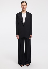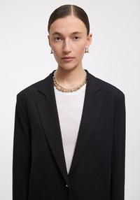 Our best-selling MERCEDES blazer is tailored of a sustainable, ecovero viscose blend. It has a boxy silhouette and slim sleeves, while it features our signature high slit on the back and detailed with a golden A-motif button opening on the front. Size and Fit Designed for a loose fit, take your normal size. The model is 178 cm and wears a size 36. Fabric and Care 83% Ecovero Viscose 14% Polyester 3% Elastane Do not wash, Do not bleach, Do not tumble dry, Iron medium temperature, Suitable for dry cleaning, Suitable for professional wet cleaning