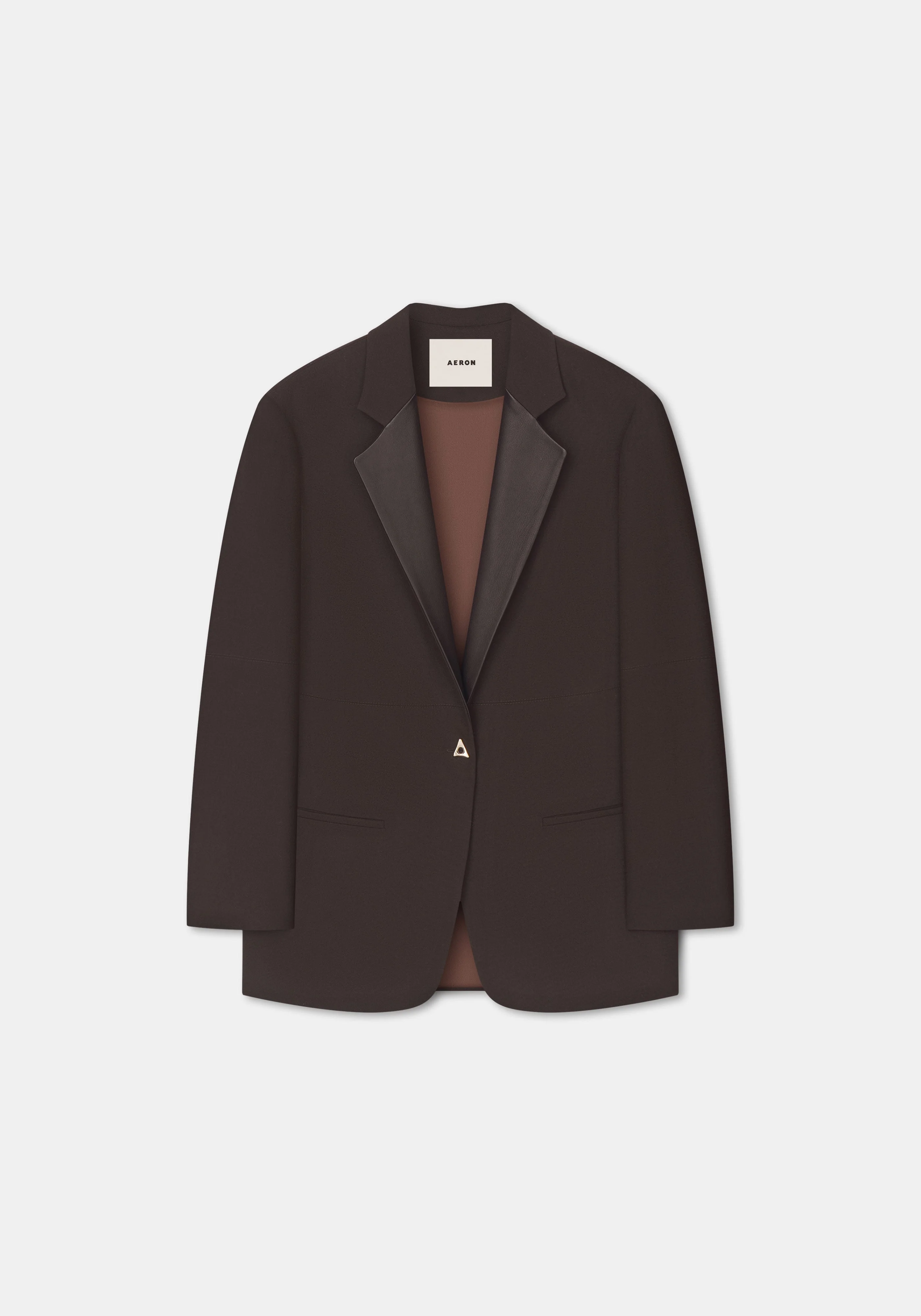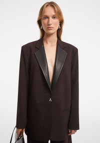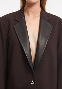 Our signature MERCEDES single-breasted blazer features a sharp leather-paneled collar and a high slit at the back, bringing a bold contrast and architectural elegance to tailoring. The defined shoulders and clean lines elevate its refined silhouette, while the A-button adds a subtle yet distinctive touch. Size and Fit Fits true to size, take your normal size. Fabric and Care 68% polyester, 29% viscose, 3% elastane, Lining: 100% viscose Do not wash, Do not bleach, Do not tumble dry, Iron at low temperature, Dry clean