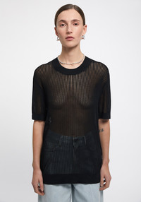 Our SHALOTT short sleeved top is made of a loosely knitted, delicate ribbed structure. This piece has an elongated silhouette and a regular fit, perfect for an everyday, comfort look. Size and Fit Fits true to size, take your normal size. The model is 180 cm and wears a size S. Fabric and Care 85% Viscose 15% Polyamide Hnad wash at 30°C, Do not bleach, Do not thumble dry, Do not iron, Do not wring, Dry flat, Suitable for dry cleaning