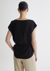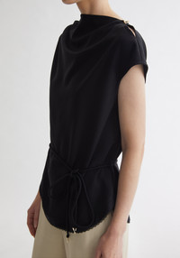 Our MOON sleeveless top introduces an elegant sense of ease through its softly draped silhouette and refined detailing. Cut with a fluid, slightly cocooned shape, it features a delicate lace trim tracing the curved hem. A slender belt cinches the waist, finished with our signature A-motifs that bring a subtle sculptural accent. Effortless yet polished, it pairs seamlessly with both tailored and relaxed proportions. Fabric and Care 100% lyocell Do not wash, Do not bleach, Do not tumble dry, Do not iron, Dry clean