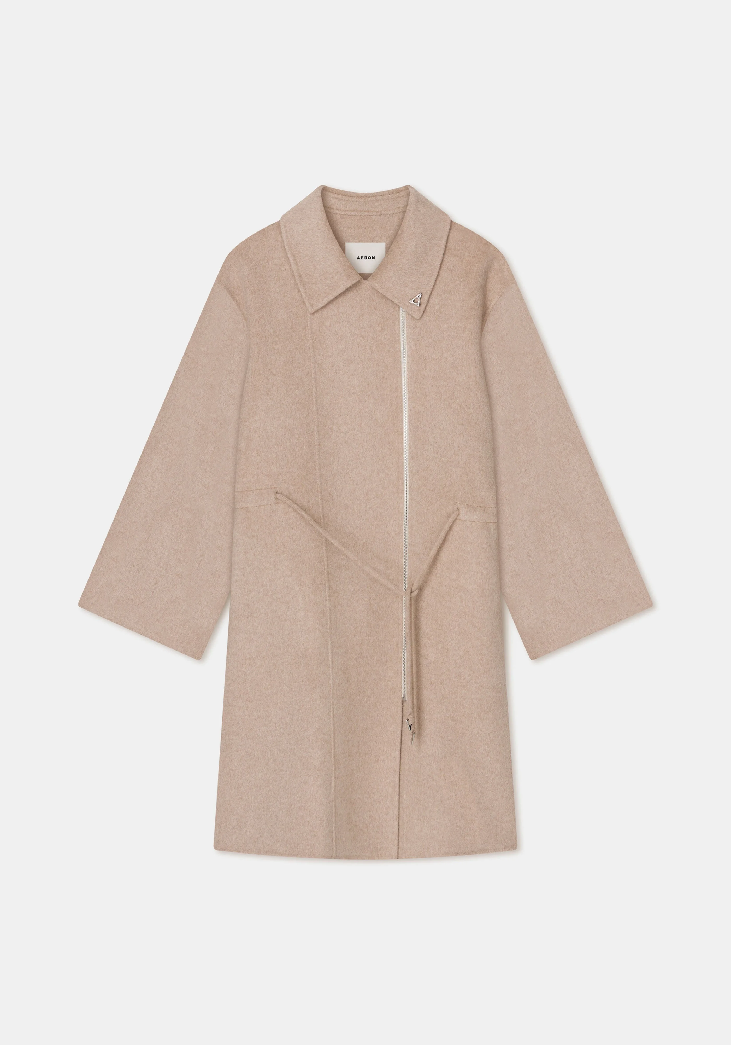Our NORMAN wool zip-up coat is made of a rich blend of cashmere, silk, and wool for a super soft and warm feel. This piece has a relaxed fit and tonal drawstrings at the waistline to play with its silhouette. It features a small A-motif on the collar and on the drawstrings that adds an elegant, luxe touch. Size and Fit Fits true to size, take your normal size. The model is 173 cm and wears a size 36. Fabric and Care 7% Cashmere 10% Spun Silk 63% Superfine Wool 20% Dacron Do not wash, Do not bleach, Do not tumble dry, Iron at low temperature, Suitable for dry cleaning, Suitable for professional wet cleaning