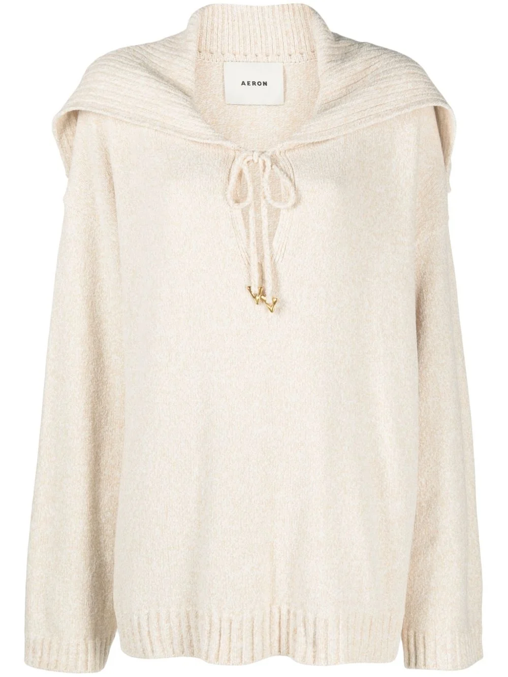 Pearl cape-style jumper Spun from a soft blend of combed cotton, Aeron's Pearl is cut to a relaxed silhouette and elevated with a tie-fastening panel that drapes over the shoulders creating a layered effect. Highlights - Cream white - Knitted construction - Brushed effect - Cape design - Front tie fastening - Drop shoulder - Long sleeves - Ribbed cuffs and hem Imported Composition Combed Cotton 47%, Viscose 40%, Polyamide 12%, Spandex/Elastane 1% SIZE & FIT Model measurements Height 5 ft 11 in(1.8 m) Bust/Chest 34.25 in(87 cm) Hips 35.82 in(91 cm) Waist 24.8 in(63 cm) FittingInformation Designed for an oversized fit, offering additional room throughout Made with a midweight knit, this piece offers some stretch This piece fits true to size – take your usual size