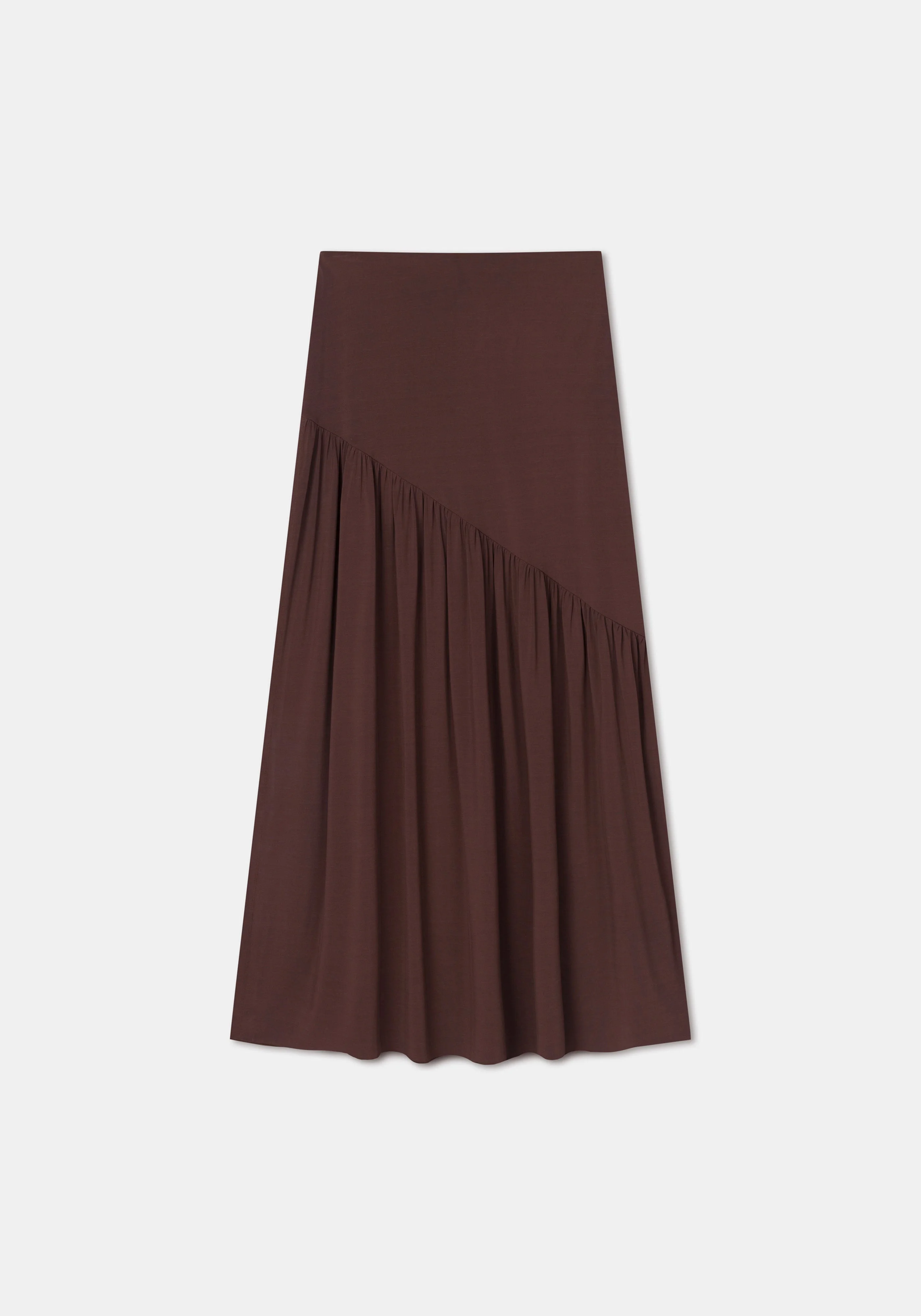 Our ORCHARD jersey maxi skirt is made of a sustainable FSC-certified viscose and elastane blend for a soft, stretchy and fluid fit. Designed with an asymmetric gathered panel, this skirt falls into an elegant drape that flatters and elongates the silhouette. A subtle yet striking side slit adds ease of movement and a touch of allure, making it perfect for both day and evening styling. Size and Fit Fits true to size, take your normal size. The model is 180 cm and wears a size S. Fabric and Care 93% FSC Viscose 7% Elastane Hand wash at 30°C, Do not bleach, Do not tumble dry, Iron at a medium temperature, Suitable for dry cleaning, Suitable for professional wet cleaning